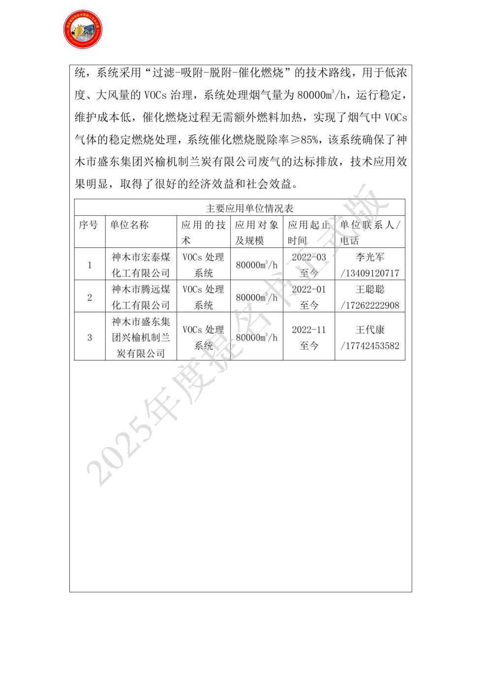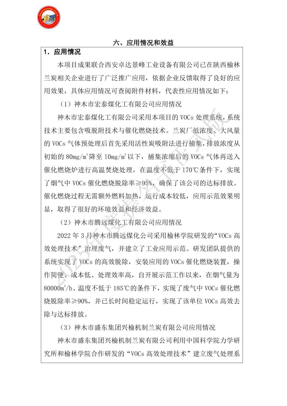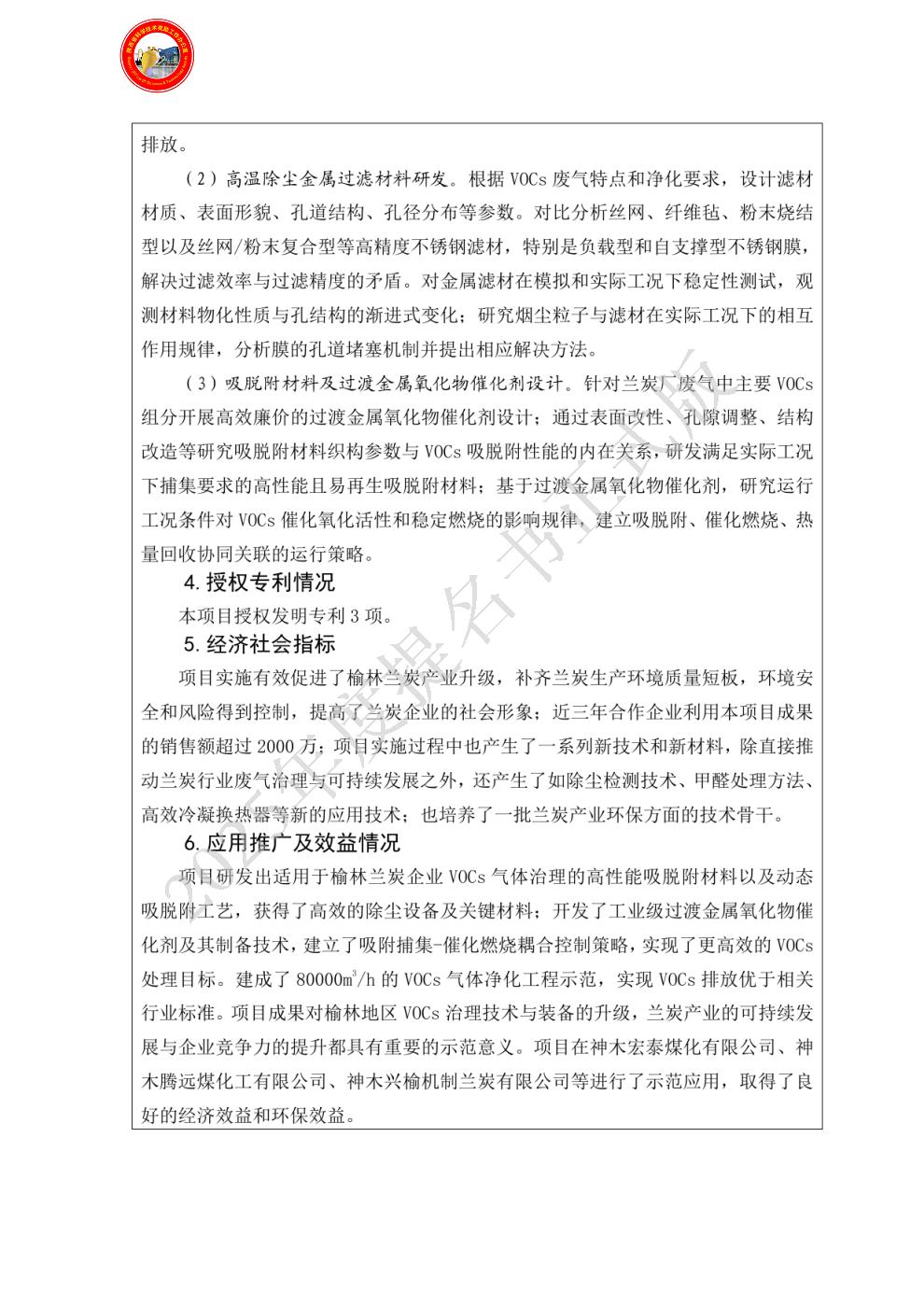 单位贡献:榆林学院持续支持了项目团队的研发工作,并充分利用与榆林市多家企业良好的合作关系,推动了项目成果的市场化应用。针对项目研发的催化燃烧技术、高温除尘设备以及吸脱附装置进行了大量宣传和推广,以榆林兰炭产业为中心,助力项目团队不断地向其它VOCs治理市场进行成果转化。为了保证项目成果的时效性,榆林学院投入了大量的人财物的支持,为项目延续和技术更新提供了坚实保障。