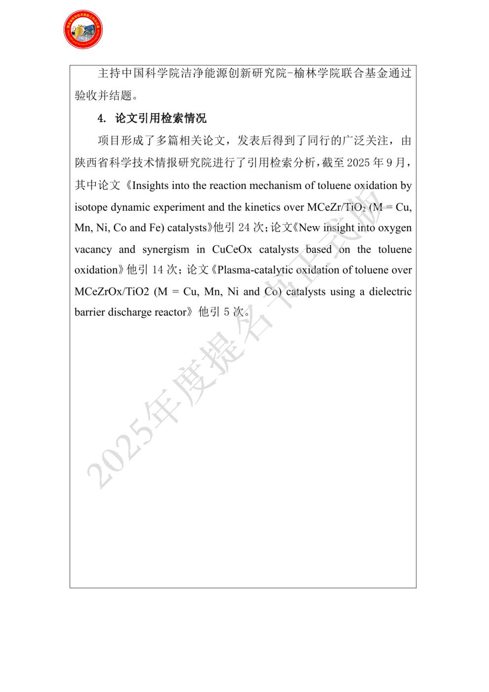 | 提名单位意见: | 该成果在中国科学院洁净能源创新研究院-榆林学院联合基金项目的支持下,针对榆林兰炭行业产生的VOCs 废气处理技术效率低下、运行成本高及二次污染等问题,围绕兰炭生产工艺中产生的VOCs 废气的除尘、吸附-脱附、催化燃烧等几个核心技术问题开展基础研究和装备研发,选题立足区域产业需求,研究成果创新突出。采用“吸附捕集+催化燃烧”技术来处理低浓度、大流量的 VOCs 废气并最终实现无害化处理,探索出影响VOCs 废气处理的关键影响因素,获得高效的除尘、吸脱附、催化燃烧工艺及关键材料并建立了吸附捕集-催化燃烧耦合控制策略。项目成果对 VOCs 废气治理技术与装备的升级、兰炭产业的可持续发展与企业竞争力的提升、改善兰炭生产区生活环境都具有重要的示范意义。 |
