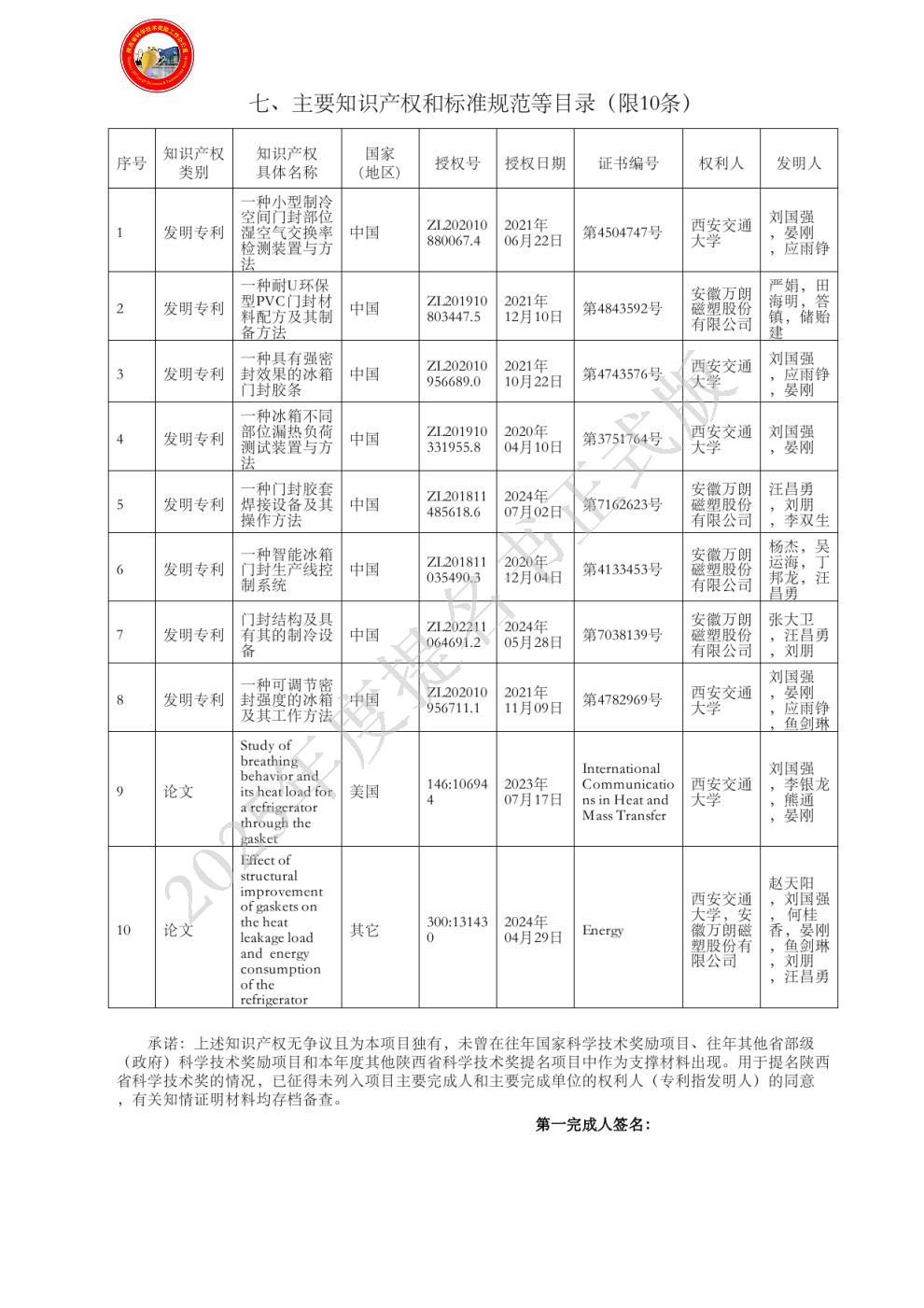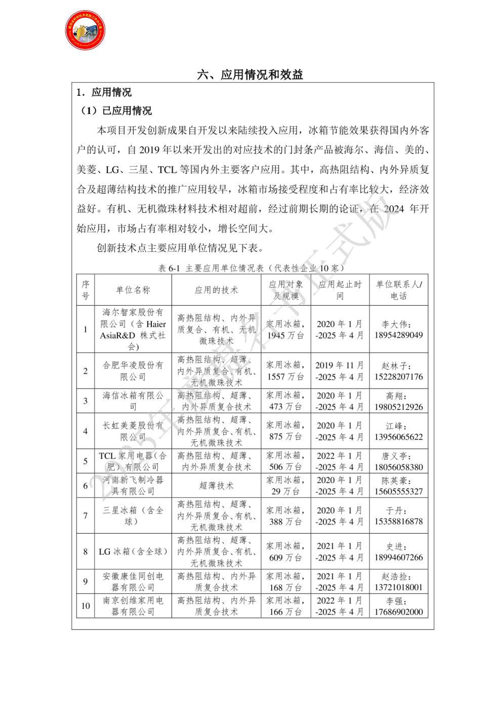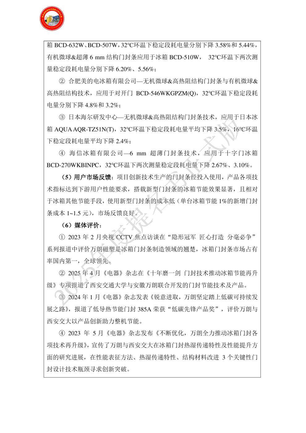 单位贡献:安徽万朗磁塑股份有限公司是本项目的主要完成单位,开发出多种门封条节能技术,成功在国内外主要家电企业应用,项目发表6篇国内外论文,授权与申报发明专利11件、实用新型专利20件、制订行业、团体标准4项、企业标准5项,获得各项奖励10余项。