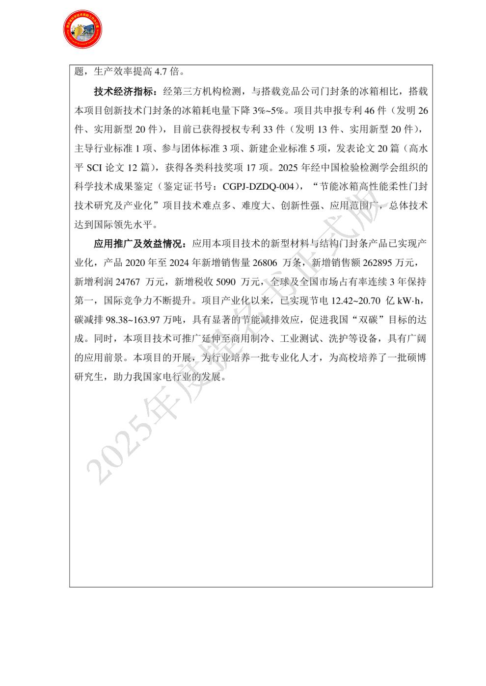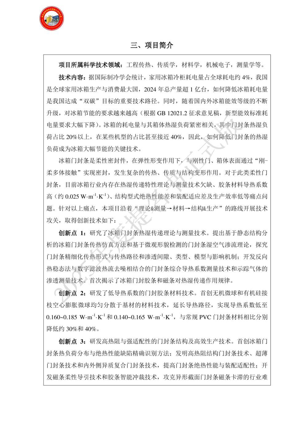 | 提名单位意见: | “节能冰箱高性能柔性门封技术研究及产业化”项目面向家电行业节能降耗需求,取得了系统性创新与突破,提名申报科技进步奖。
