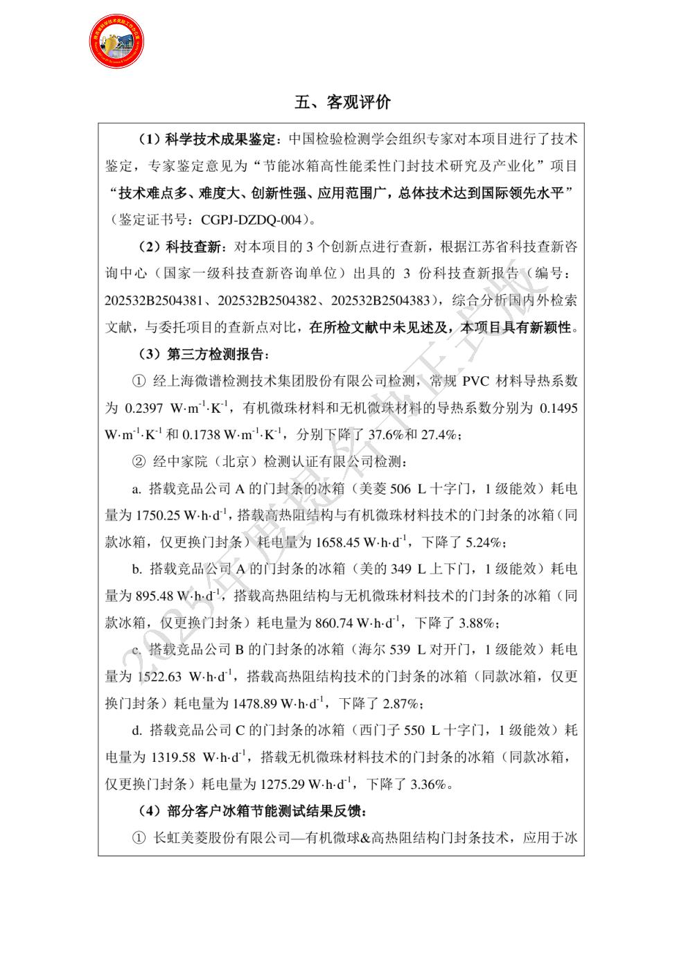 应用该创新技术的冰箱整机耗电量显著降低3%~5%,至2024年累计节电12.4~20.7亿千瓦时,碳减排98.38~163.97万吨,经济与社会效益巨大。中国检验检测学会组织的科学技术成果鉴定(鉴定证书号:CGPJ-DZDQ-004),认为技术难点多、难度大、创新性强、应用范围广,总体技术达到国际领先水平。项目显著提升了我国冰箱节能技术的国际竞争力,为落实“双碳”战略做出了突出贡献,完全符合科技进步奖标准。