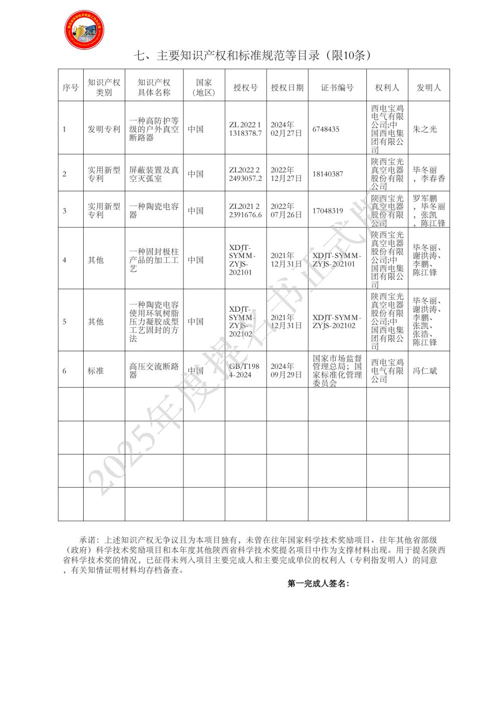 | 主要完成单位及创新推广贡献: | - 单位名称:西电宝鸡电气有限公司