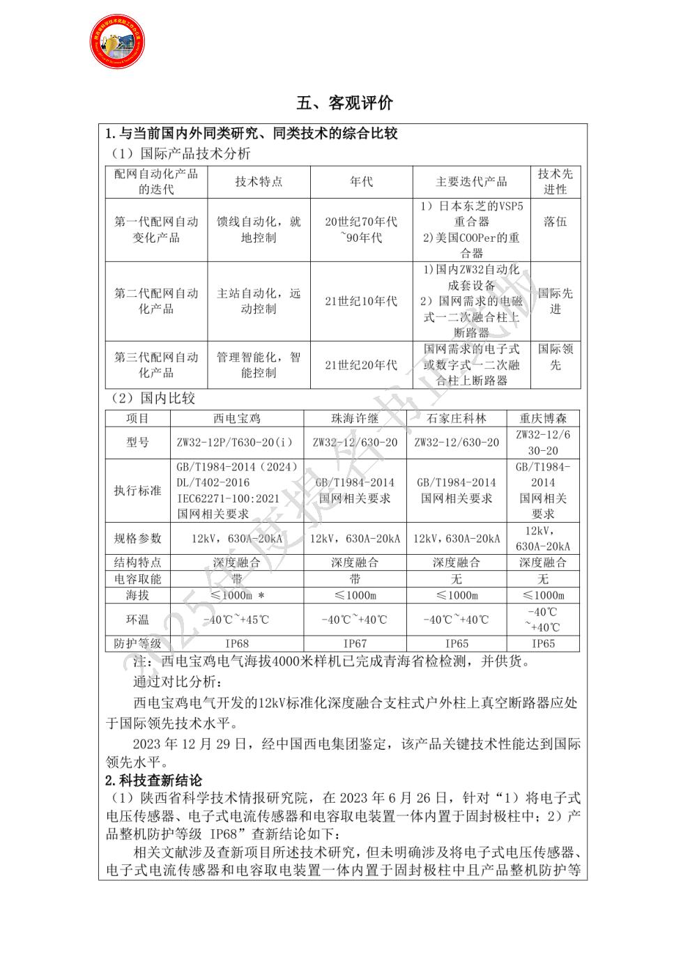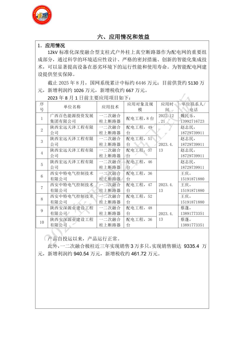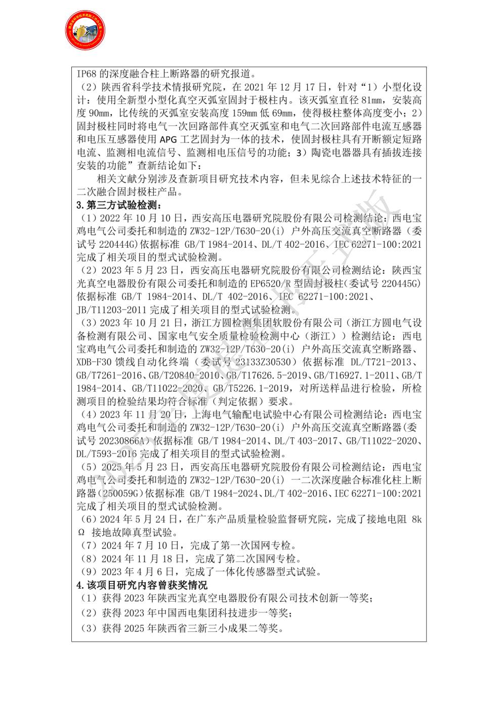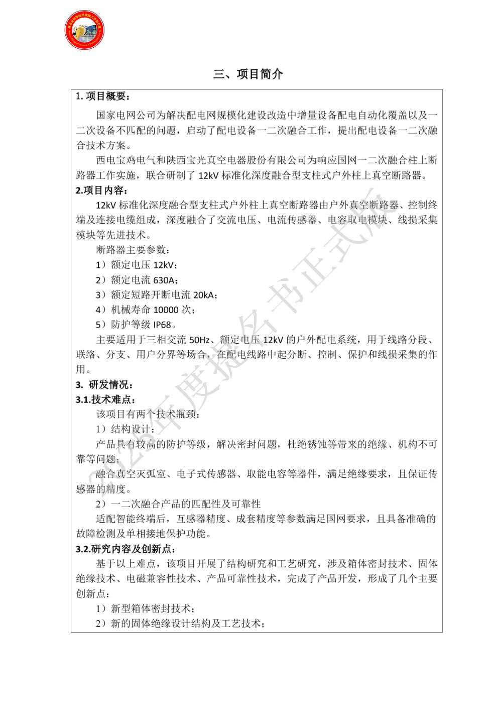 单位贡献:12kV标准化深度融合型支柱式户外柱上真空断路器由西电宝鸡电气承担开发,负责项目总体及方案设计,样机试制,型式试验。