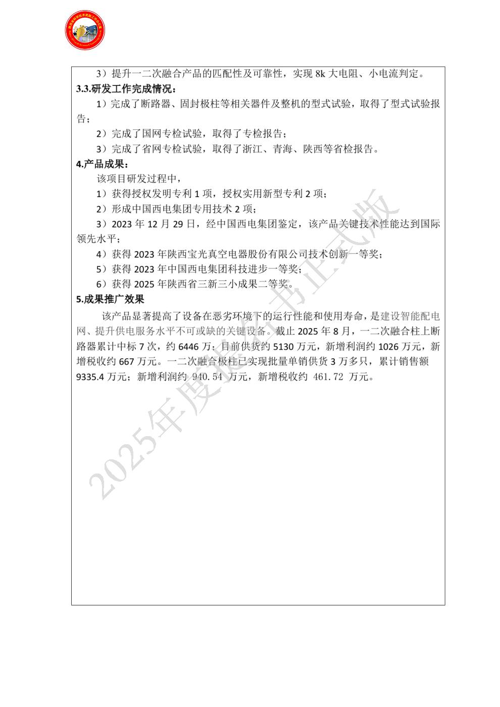 本成果为西电宝鸡电气与陕西宝光真空电器股份有限公司联合研发完成,已形成发明专利1项,实用新型2项,先后荣获行业科技奖3项。项目已在国网、省网等通过检测且实际应用,获得了客户一致好评。