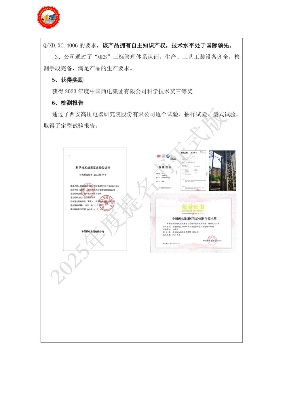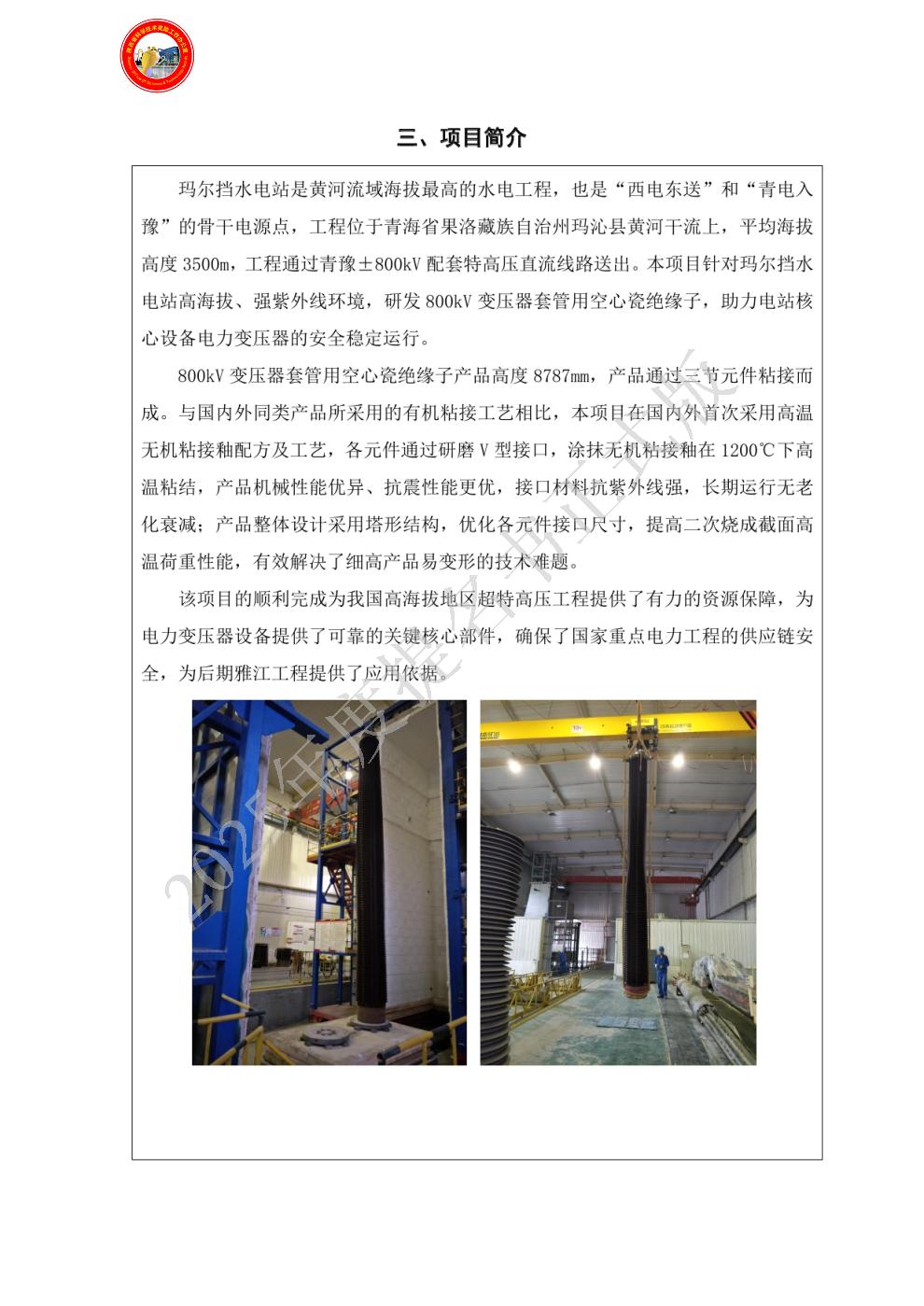| 提名单位意见: | 项目所研制的“ 高海拔地区800kV变压器套管用空心瓷绝缘子”产品综合技术水平国际领先,产品已成功应用于青海玛尔挡水电站工程,用户反映良好。以下是推荐理由: