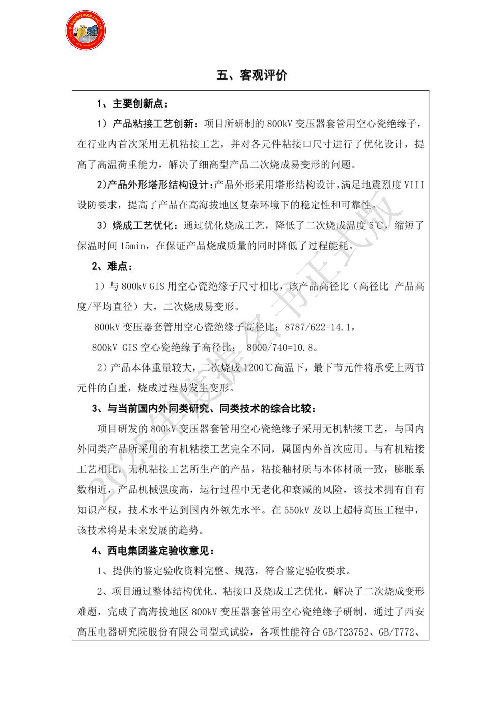 1、产品粘接工艺创新:项目所研制的变压器套管用空心瓷绝缘子,在行业内首次采用无机粘接工艺,并对各元件粘接口尺寸进行了优化设计,提高了高温荷重能力,解决了细高型产品二次烧成易变形的问题。