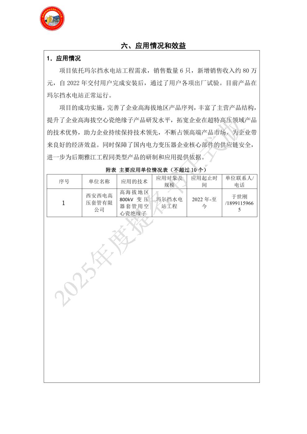 单位贡献: 本项目作为服务国家重大能源战略的示范性成果,紧密围绕玛尔挡水电站工程建设需求,成功实现6只高海拔空心瓷绝缘子的研制与交付,新增销售收入约80万元。产品于2022年顺利完成安装并通过全部出厂试验,目前已在玛尔挡水电站稳定投运,性能卓越、运行可靠。