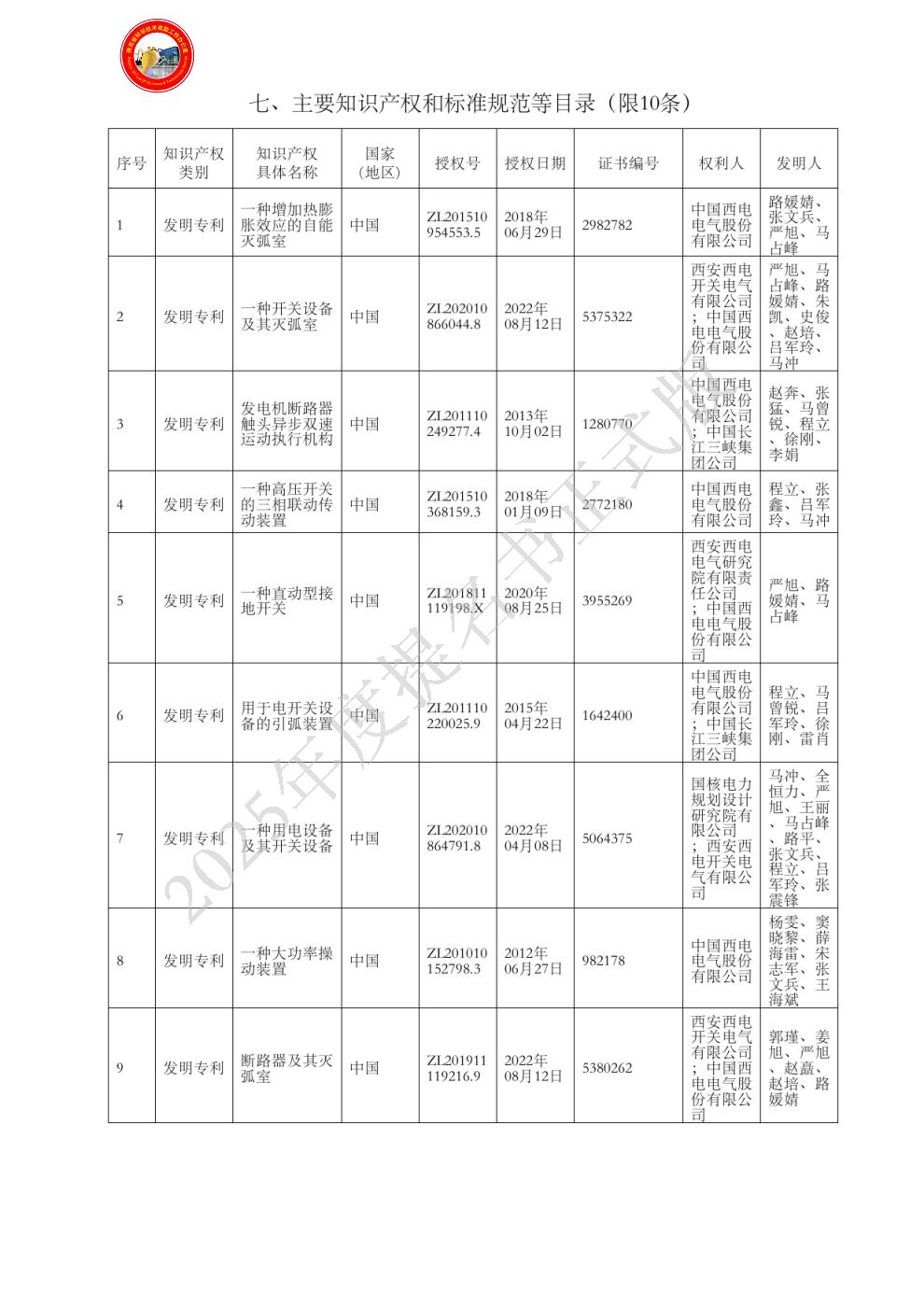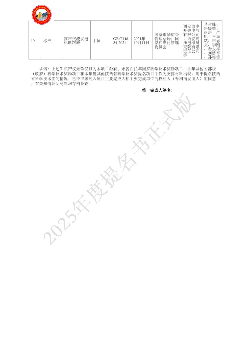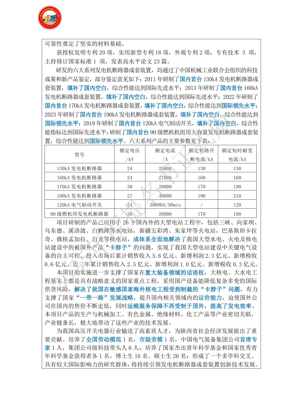 4、发电机断路器成套装置系列化产品技术成果制造、产业化平台以及工程推广应用承担单位,牵头制定了国家标准“GB/T 14824-2021”,提升了我国在大容量开断方面的国际声誉和产品竞争力,取得了显著的经济社会效益。