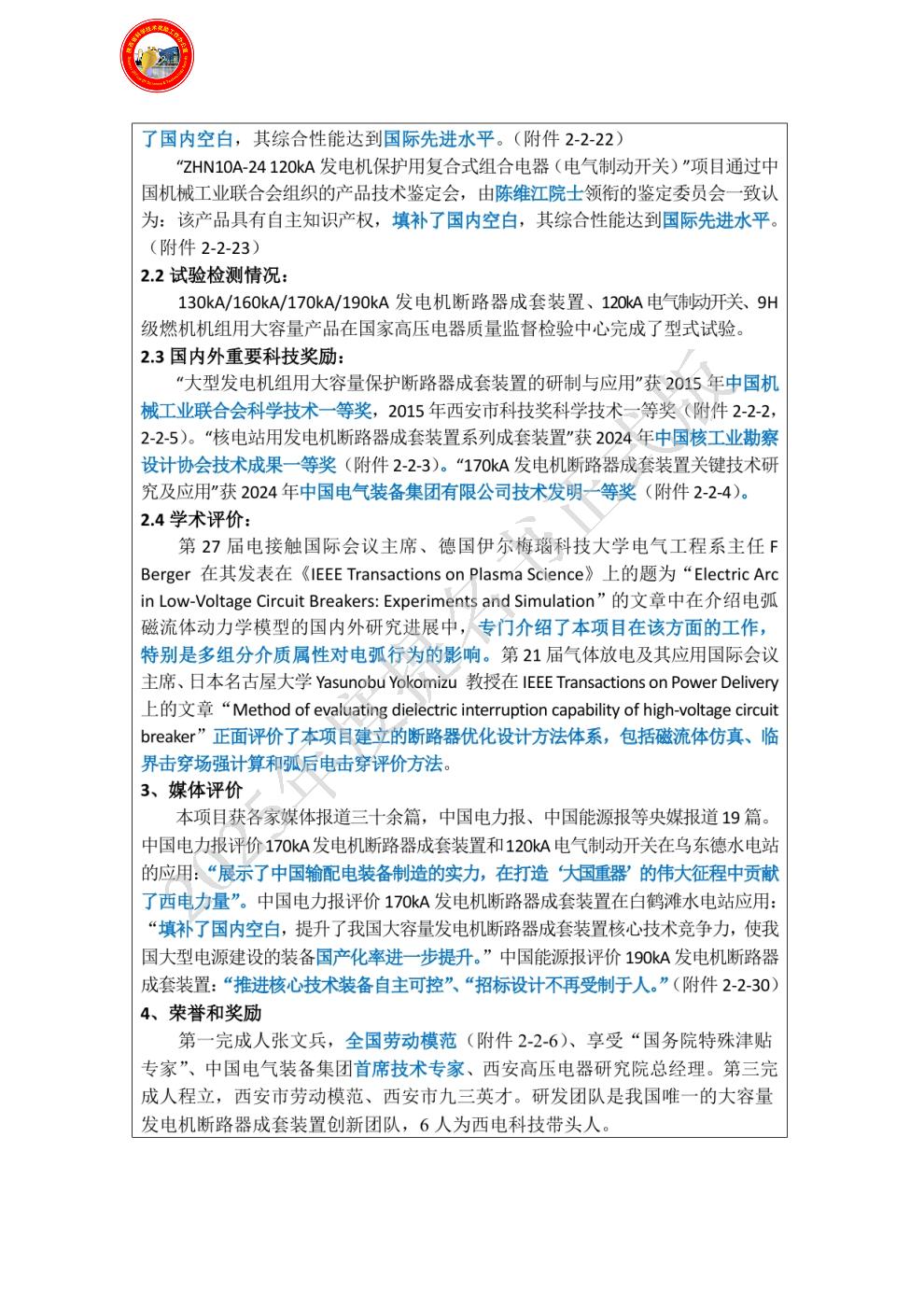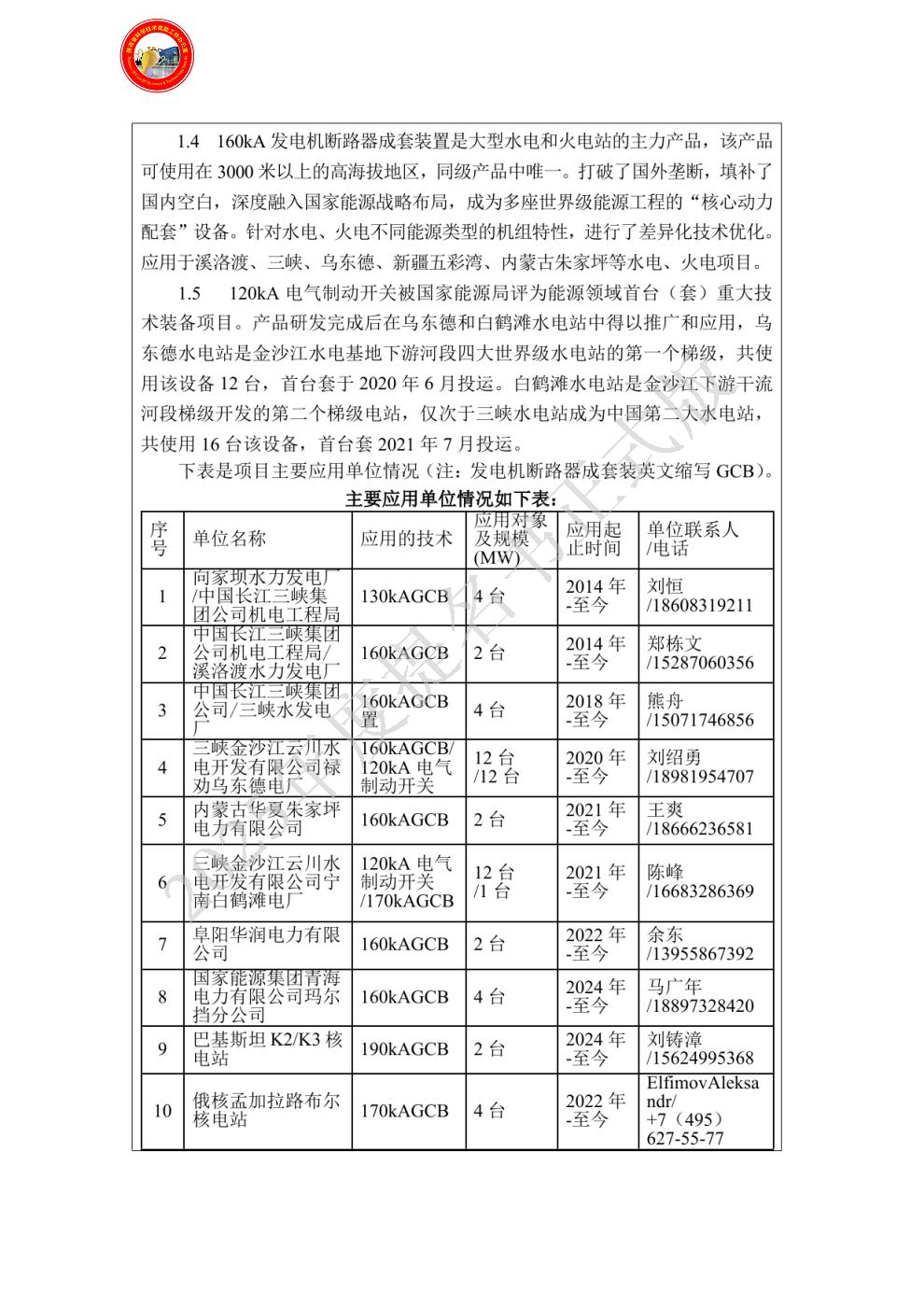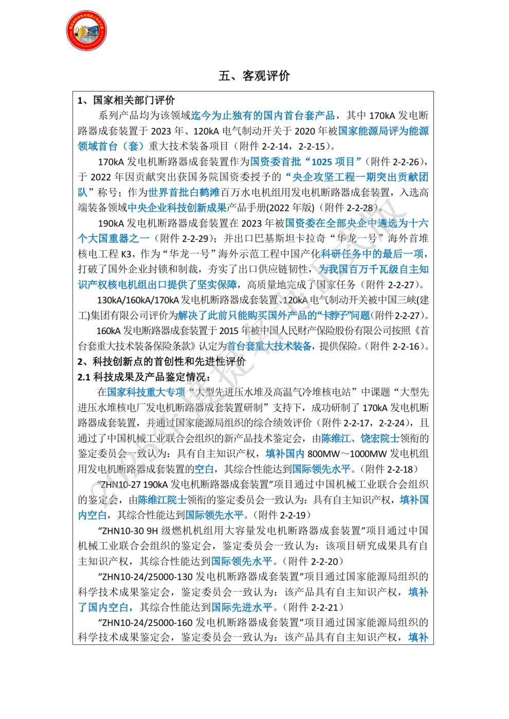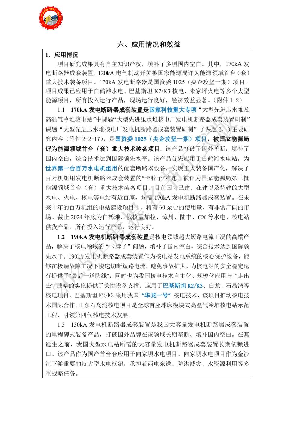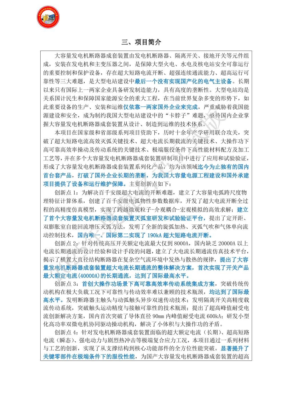 单位贡献:核电工程需求及关键技术研究,牵头组建核电用发电机断路器成套装置产学研联合体,主要贡献: