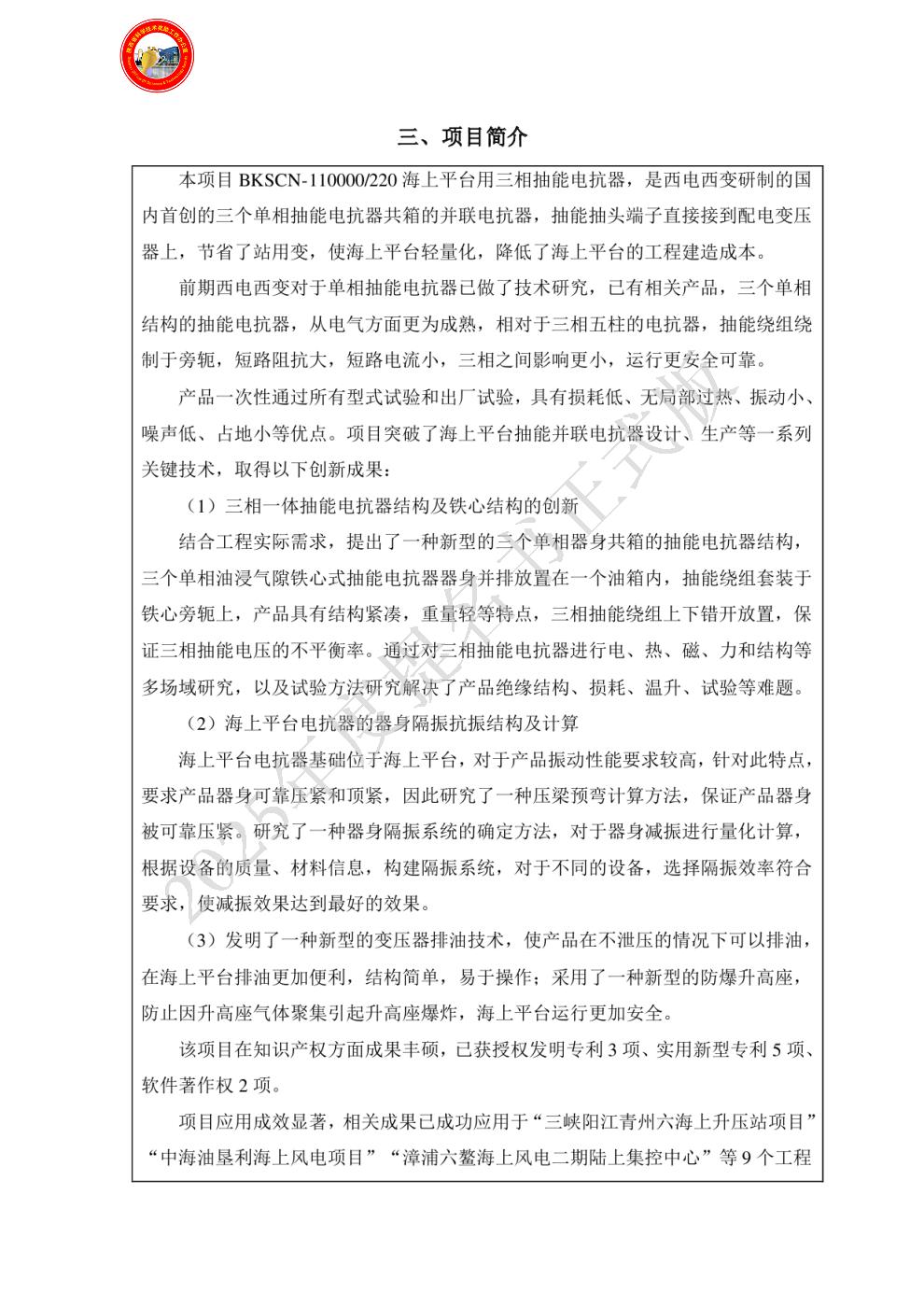 项目实现了海上平台抽能电抗器技术突破:一是首次采用三个单相共箱的抽能电抗器结构,节省站用变,降低了海上平台基础的造价,运行安全可靠;二是适用于海上平台对于电抗器振动要求高的特点,器身采用了独有的器身顶紧结构、对于器身压紧和减振进行量化计算,降低了电抗器的振动;三是发明了一种简单的排油结构和防爆结构,操作简单,为海上风电平台排油提供了便利,更利于海上平台安全运行。
