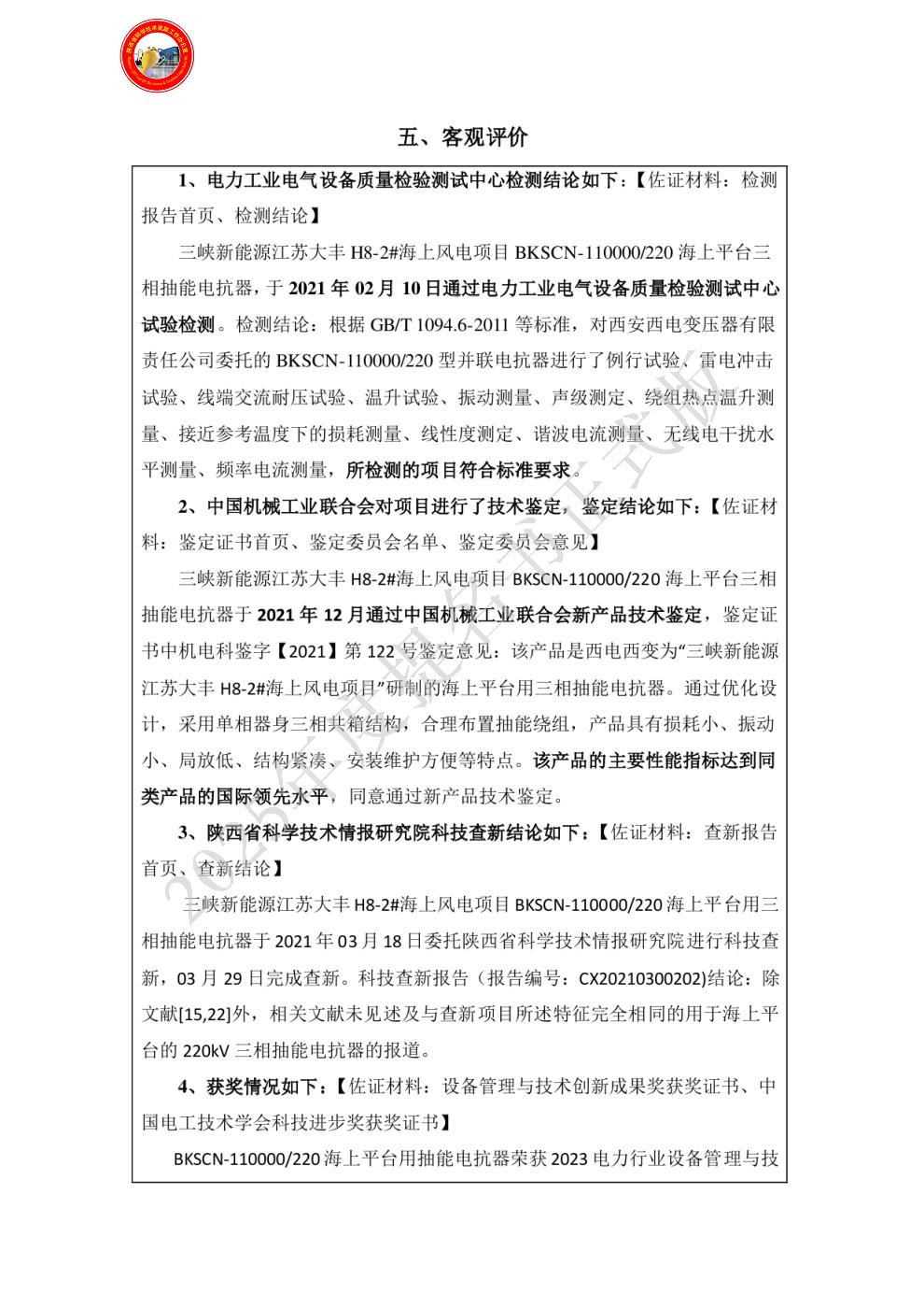| 主要完成单位及创新推广贡献: | - 单位名称:西安西电变压器有限责任公司