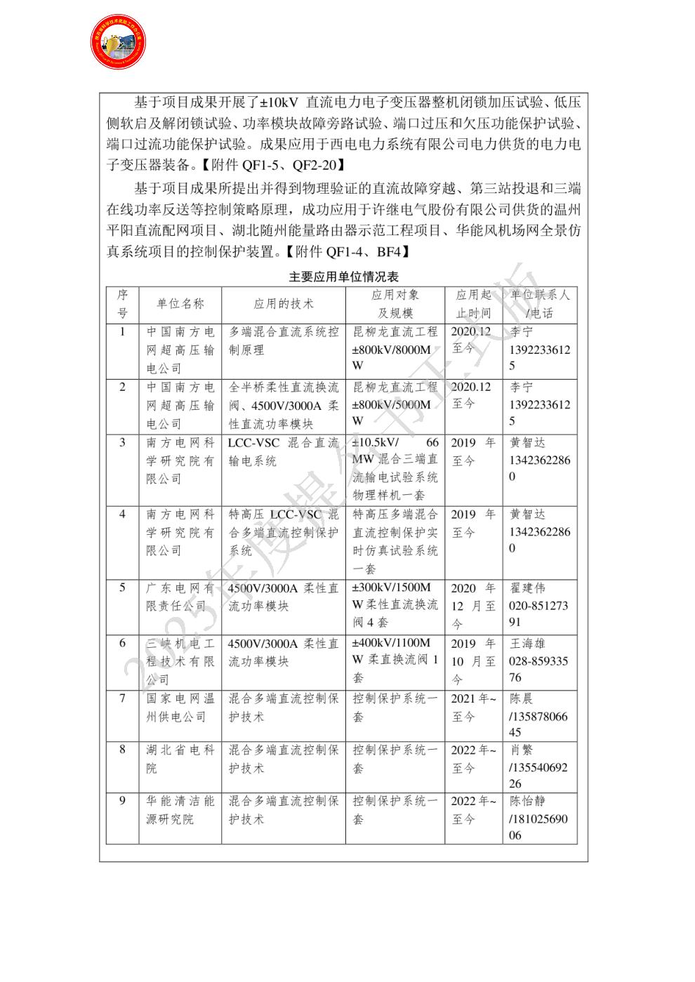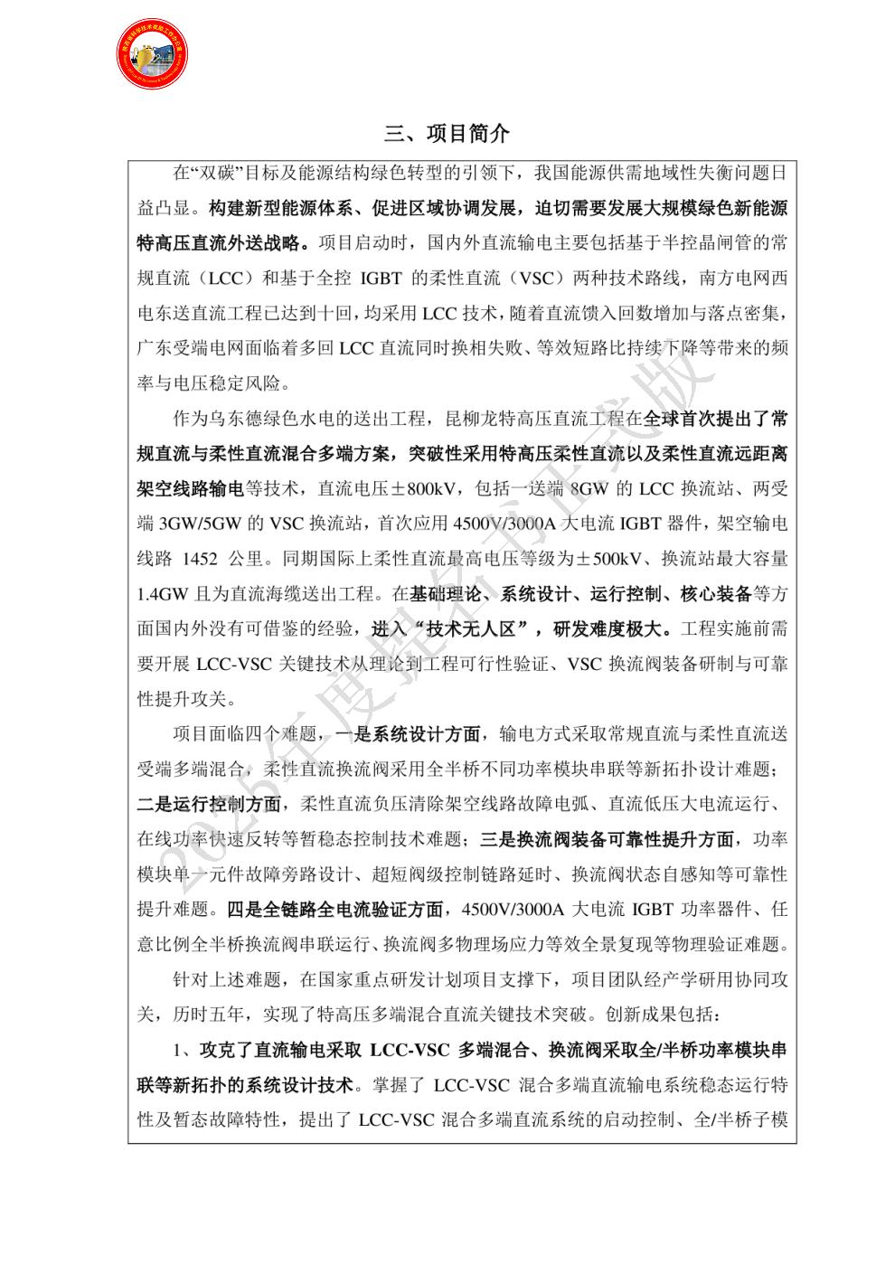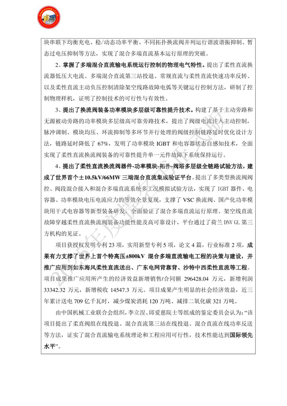 | 提名单位意见: | 该项目针对我国西电东送重大工程乌东德水电站送电广东广西输电工程需求,在国家重点研发计划项目支撑下,经产学研用协同攻关,攻克了混合多端直流输电基于不同器件技术路线和多端协调带来的系统设计难题,提出了混合多端直流输电系统运行控制与保护原理逻辑验证技术,攻克了柔性直流换流阀模块高可靠旁路设计和先进阀级控制技术,提出了柔性直流换流阀器件-功率模块-拓扑-阀塔多层级全链路试验方法,研制了世界首套±10.5kV/66MWLCC-VSC-VSC研发试验平台,项目获授权发明专利23项,实用新型专利5项,论文4篇,行业标准2项。经中国机械工业联合会组织鉴定,委员会认为: “证实了混合直流输电系统理论和工程应用可行……达到国际领先水平”。成果应用于世界首个特高压混合多端直流工程(昆柳龙直流工程),工程获评为2020年央企十大超级工程,取得19项世界第一。