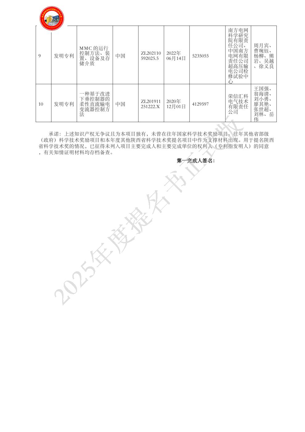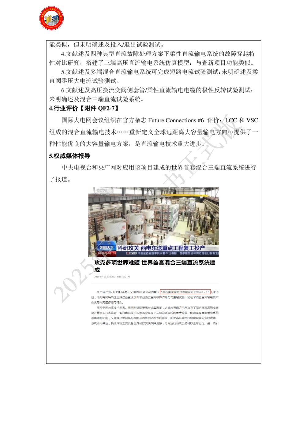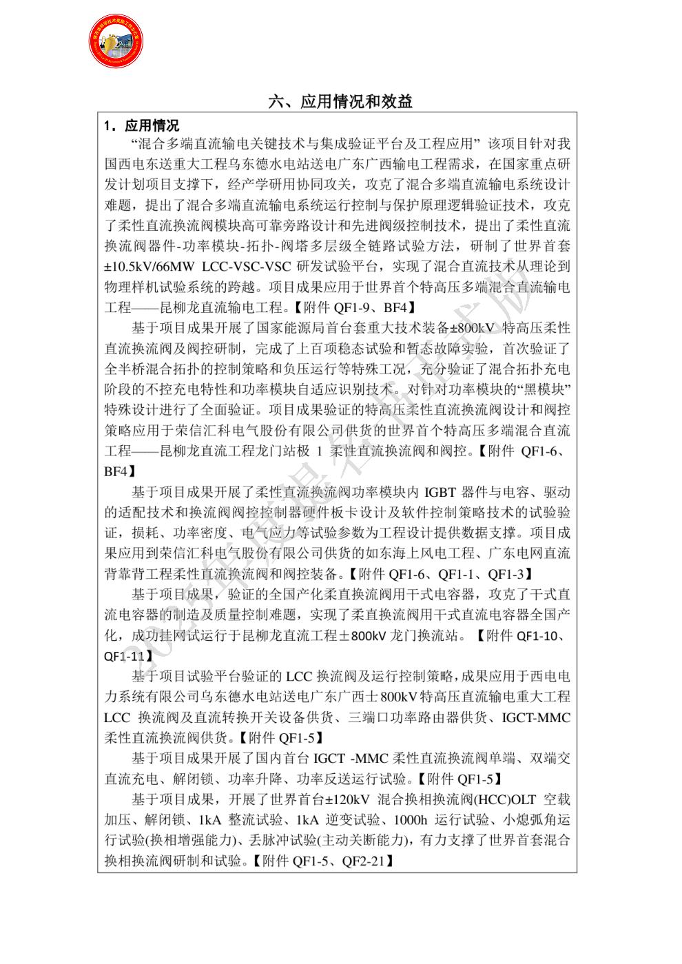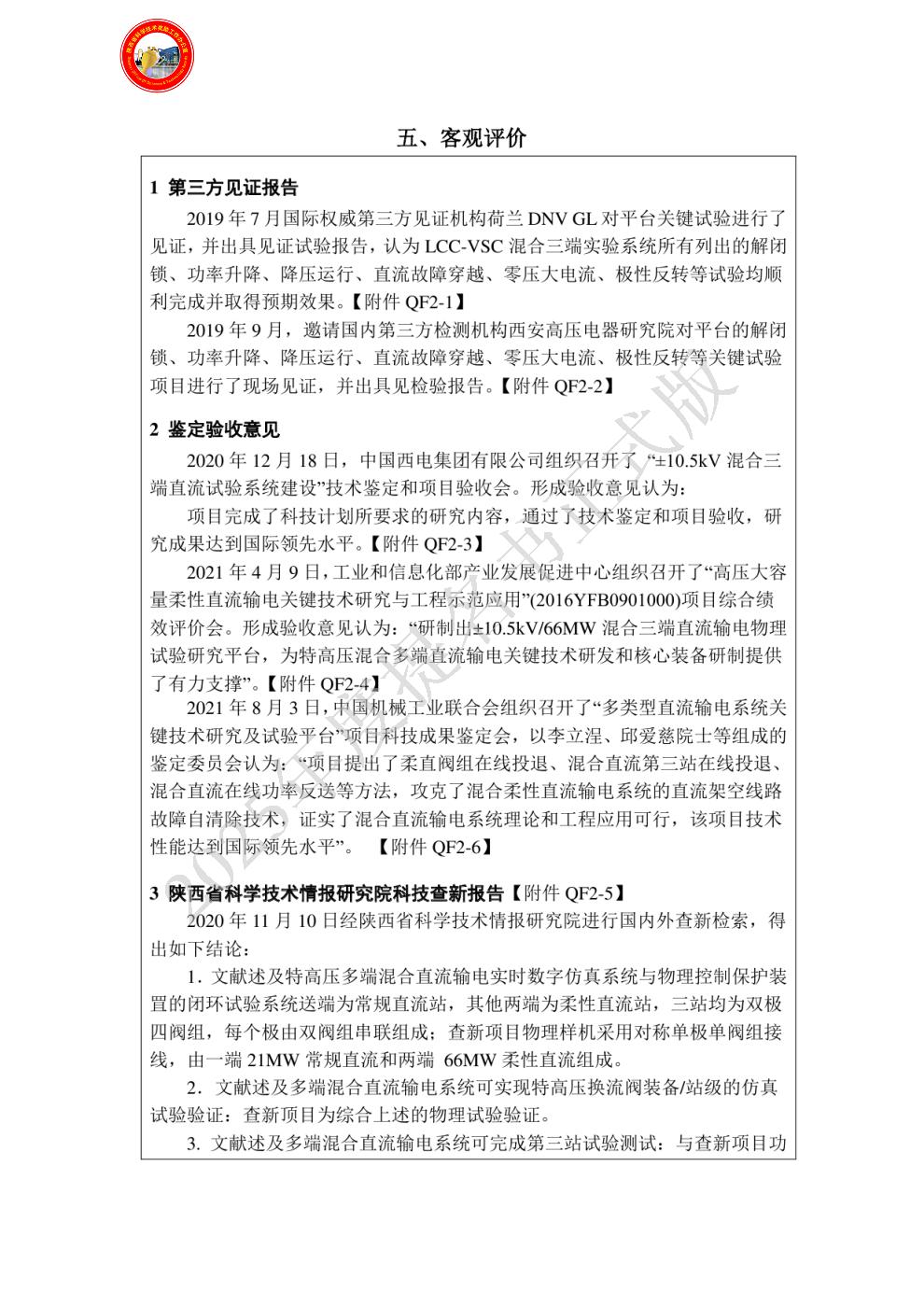 | 提名单位意见: | 该项目针对我国西电东送重大工程乌东德水电站送电广东广西输电工程需求,在国家重点研发计划项目支撑下,经产学研用协同攻关,攻克了混合多端直流输电基于不同器件技术路线和多端协调带来的系统设计难题,提出了混合多端直流输电系统运行控制与保护原理逻辑验证技术,攻克了柔性直流换流阀模块高可靠旁路设计和先进阀级控制技术,提出了柔性直流换流阀器件-功率模块-拓扑-阀塔多层级全链路试验方法,研制了世界首套±10.5kV/66MWLCC-VSC-VSC研发试验平台,项目获授权发明专利23项,实用新型专利5项,论文4篇,行业标准2项。经中国机械工业联合会组织鉴定,委员会认为: “证实了混合直流输电系统理论和工程应用可行……达到国际领先水平”。成果应用于世界首个特高压混合多端直流工程(昆柳龙直流工程),工程获评为2020年央企十大超级工程,取得19项世界第一。