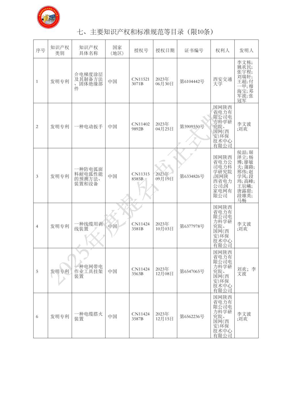 排名:7 行政职务:主任 技术职称:正高级工程师 工作单位:国网陕西省电力有限公司 对本项目技术创造性贡献:参与不停电作业系列工器具与防电弧服材料选型及结构优化调整,参与新型工器具应用培训方案设计,对本项目所列技术创新点2、3做出创新性贡献。