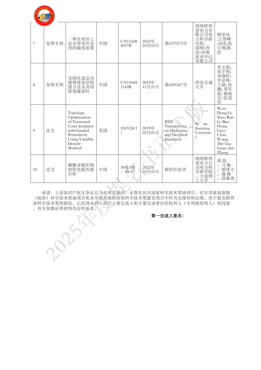 排名:6 行政职务:无 技术职称:工程师 工作单位:国网陕西省电力有限公司电力科学研究院 对本项目技术创造性贡献:项目主要研究人员,负责考虑介电梯度绝缘的不停电作业用环氧、聚合物等绝缘材料不均匀固化机理及调控方法研究,对本项目所列技术创新点1做出创新性贡献。