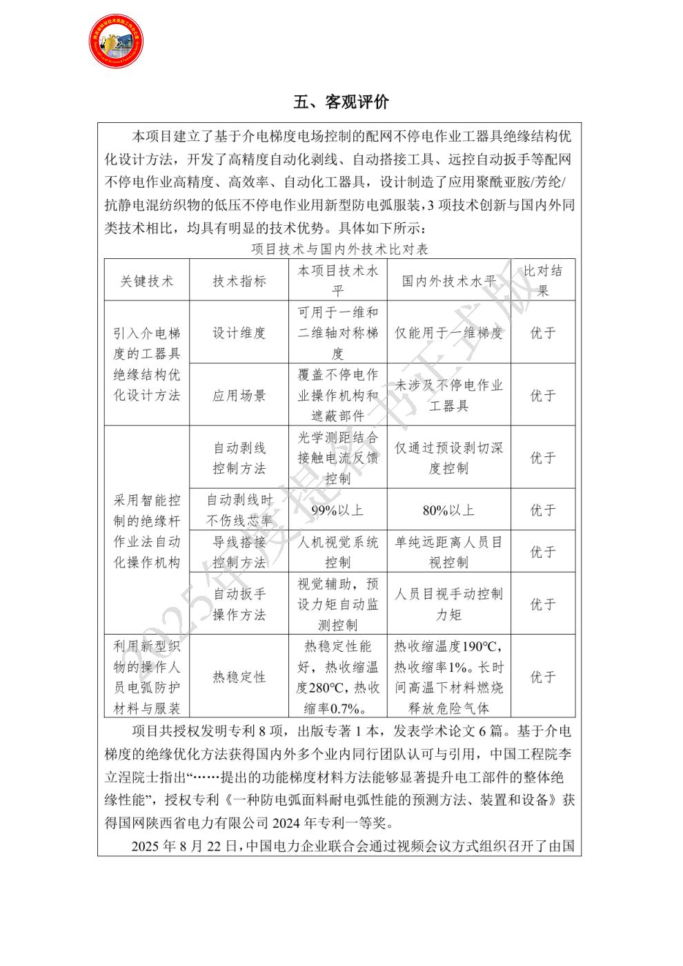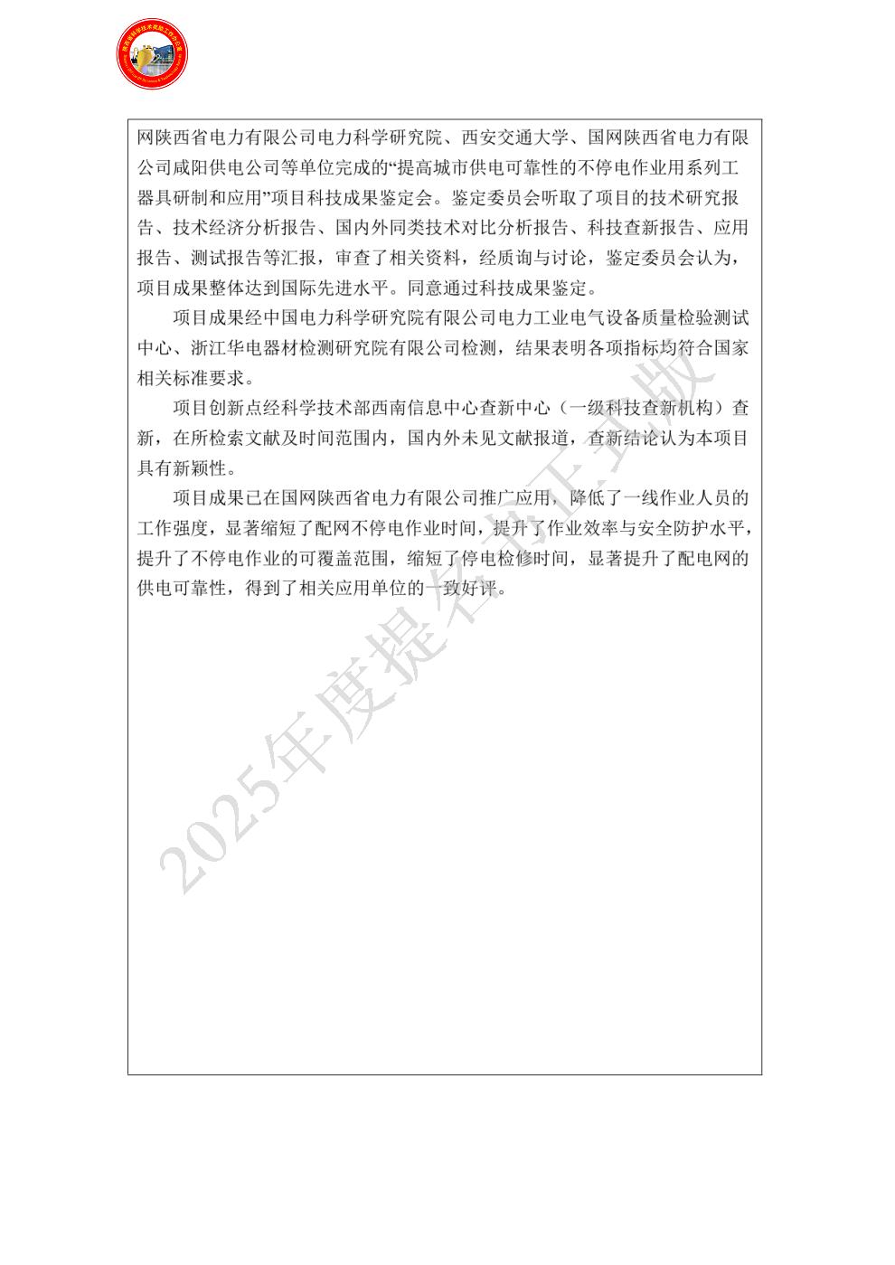 | 提名单位意见: | 该项目针对当前配网不停电作业工器具应用效率低、防护可靠性差的问题,提出了基于介电梯度绝缘的配网不停电作业装备结构优化方法,开发制造了配网不停电作业系列自动化工器具与人身防护装备,显著提升了作业效率与安全防护水平,创新性强,难度大。