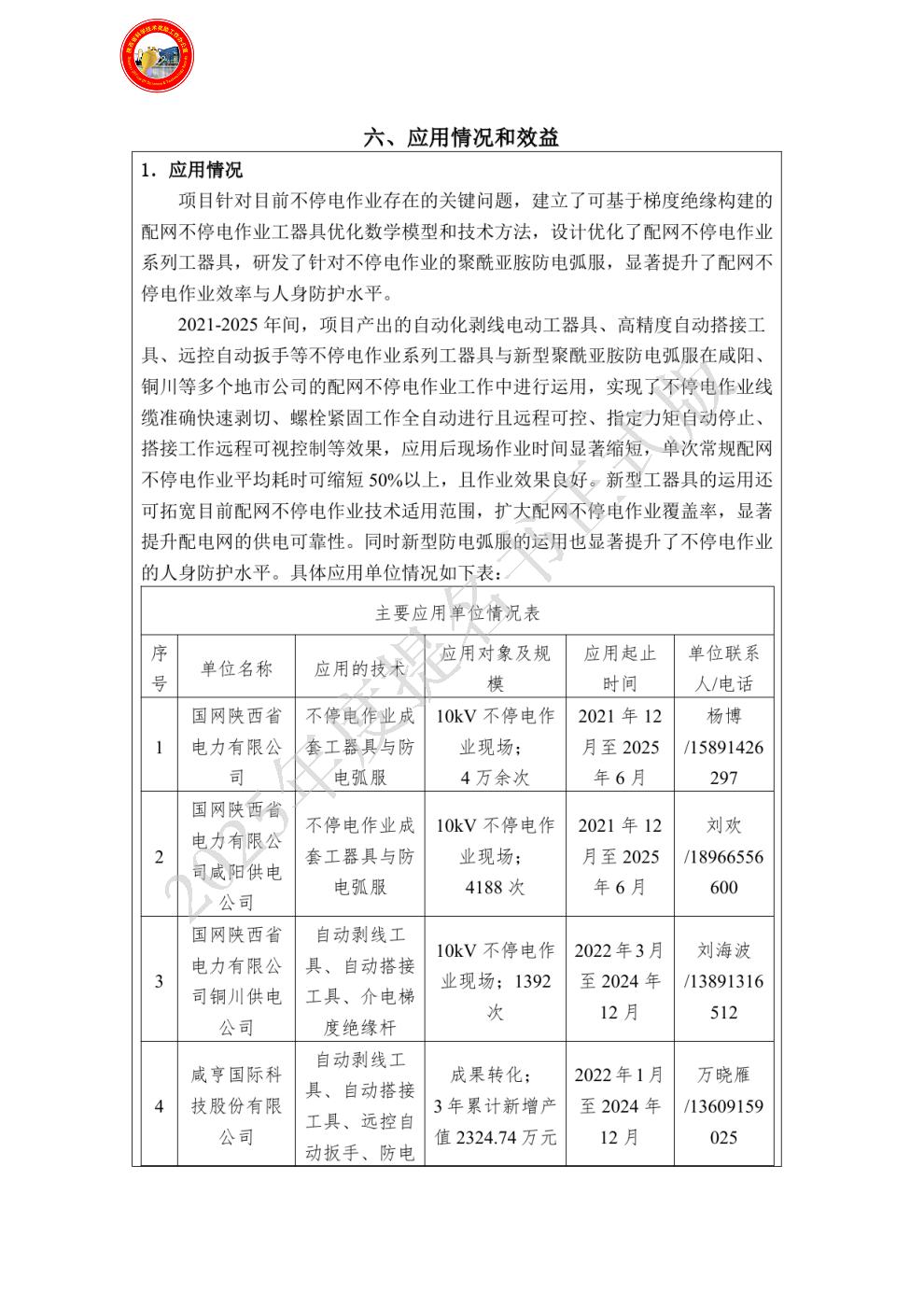 单位贡献:主要参与单位,参与不停电作业新型工器具与防电弧服的产业化设计优化与成果转化工作。