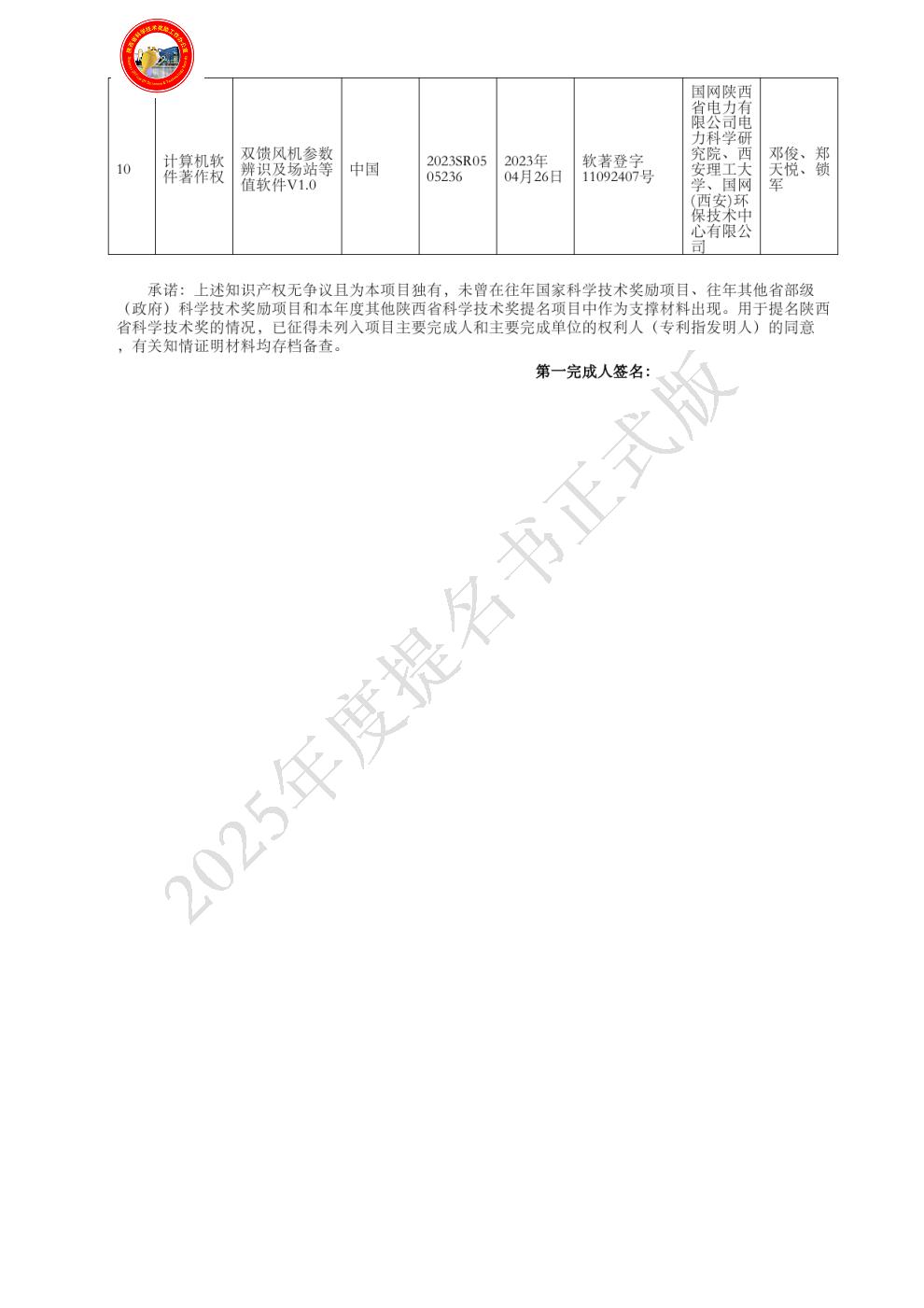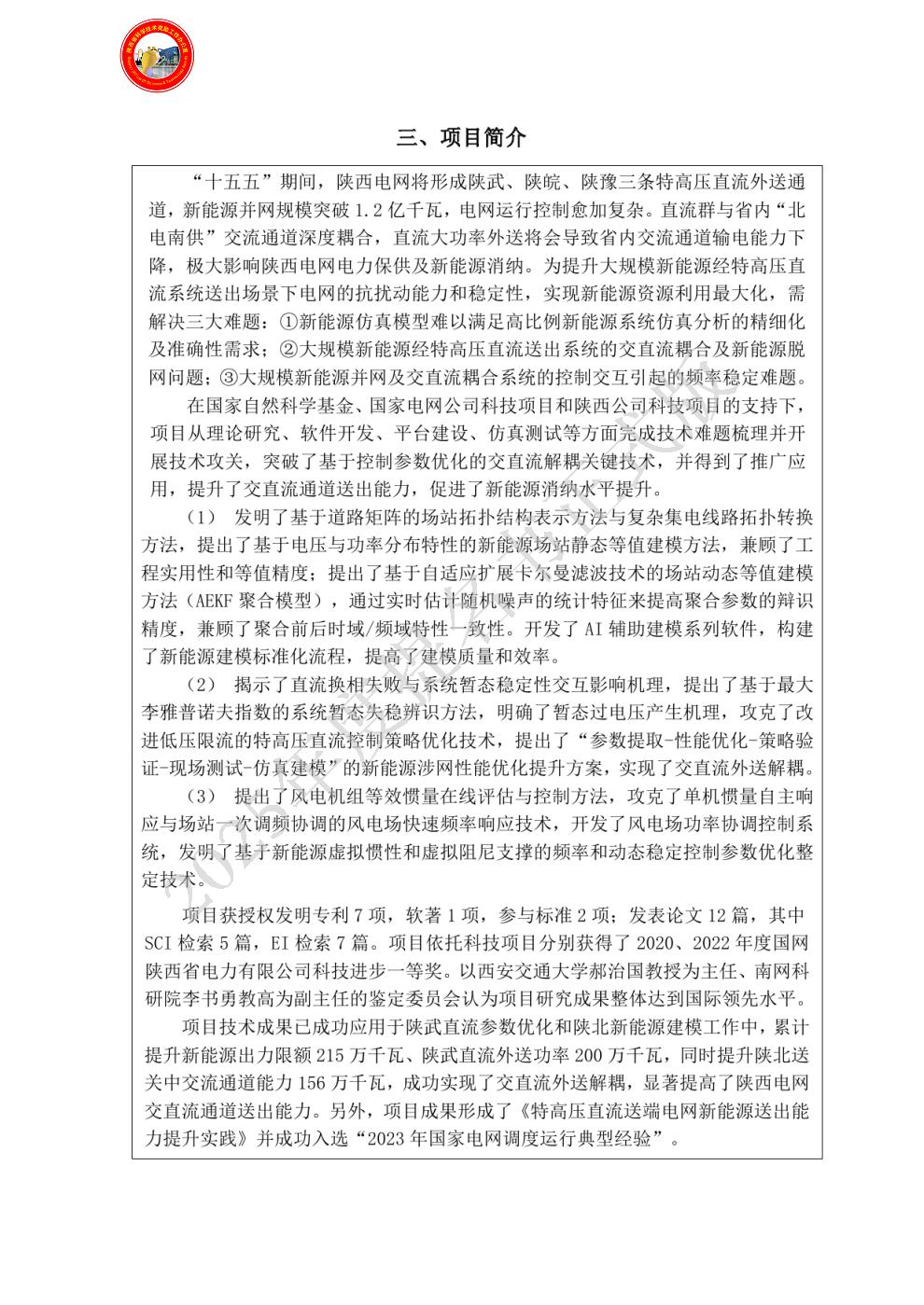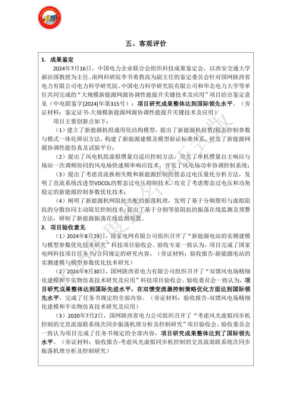 排名:2 行政职务:无 技术职称:工程师 工作单位:国网陕西省电力有限公司电力科学研究院 对本项目技术创造性贡献:本人在该项目工作中投入的工作量占同期工作总量的45%。项目主要参与人员,项目主要参与人员,提出了基于电压与功率分布特性的新能源场站等值建模方法,开展了一种直驱风电机组虚拟同步机控制参数的优化方法研究。对创新点1、2、3做出了重要贡献。[旁证材料:专利(附件1-1-1、1-1-3)。] 曾获国家科技奖励情况:(1)2021年度国网陕西省电力有限公司科技进步奖一等奖,《风电场次同步振荡现象与监测技术研究》,排名2/11,证书编号:无;