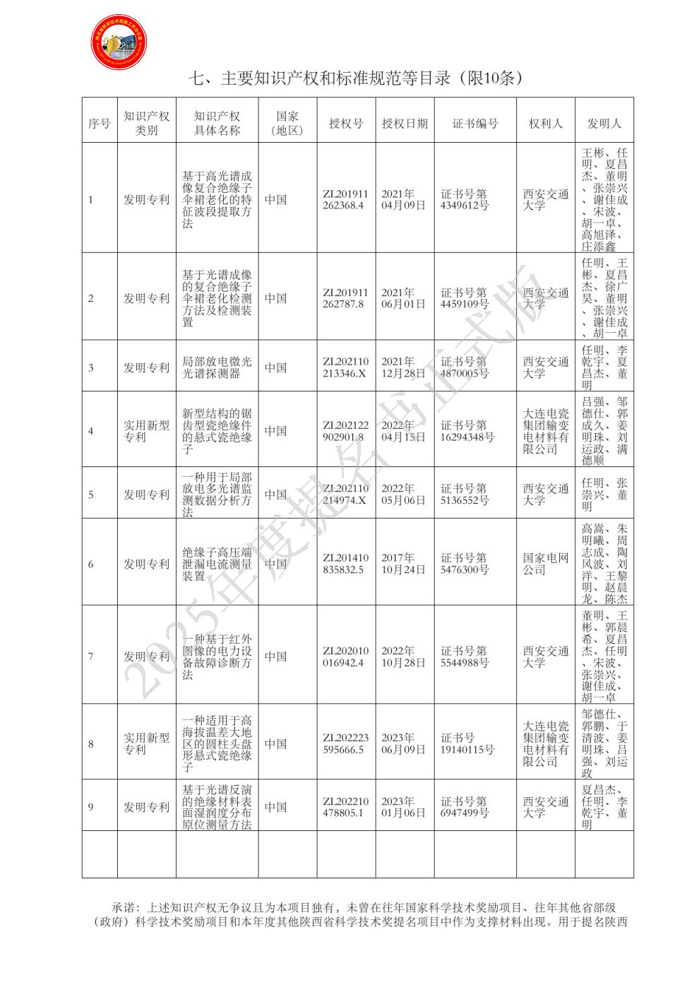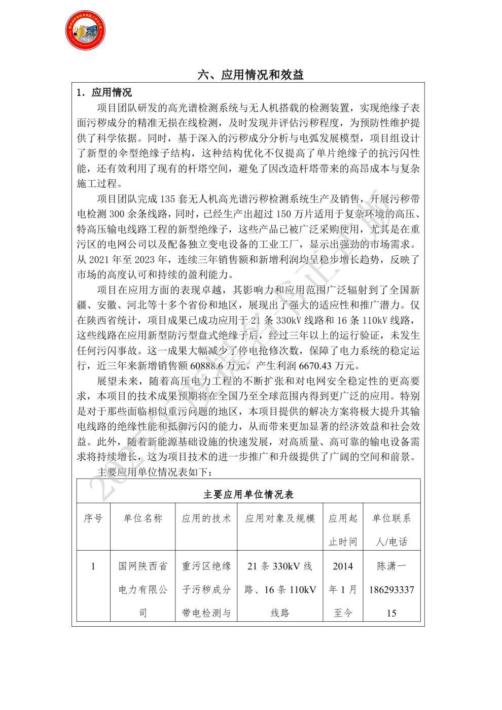 排名:7 行政职务:副主任 技术职称:高级工程师 工作单位:国网陕西省电力有限公司 对本项目技术创造性贡献:协助完成了结构优化后的绝缘子线路应用,协助进行了陕西地区绝缘子表面污秽成分高光谱数据库建立。对创新点1、3项均做出了重要贡献。[旁证材料:鉴定证书,验收报告,查新报告等]。