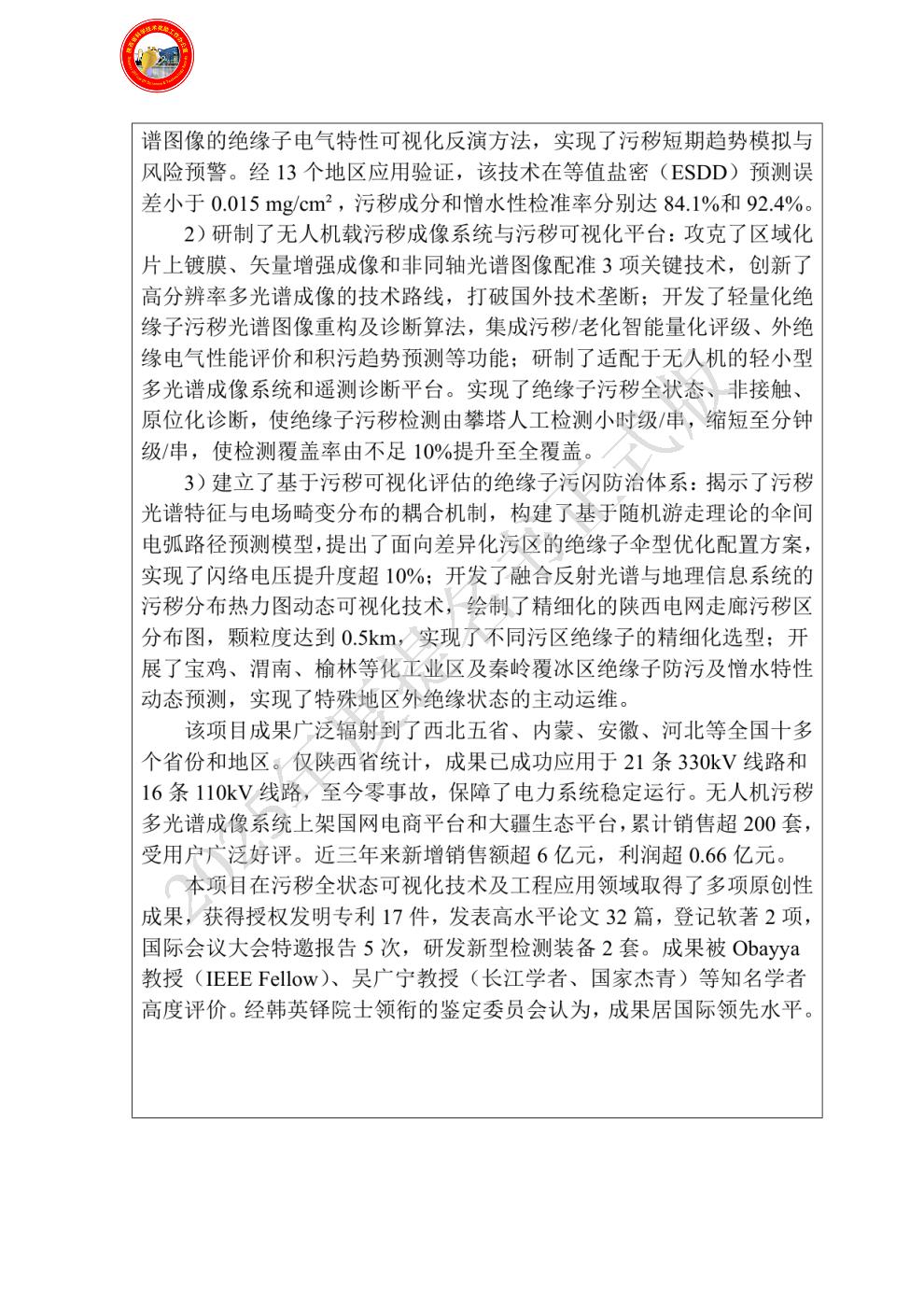 单位贡献:项目主要承担单位,参与了绝缘子表面污秽成分检测、机载污秽成分检测装置、绝缘子结构优化等技术方案制定、关键技术研究工作。