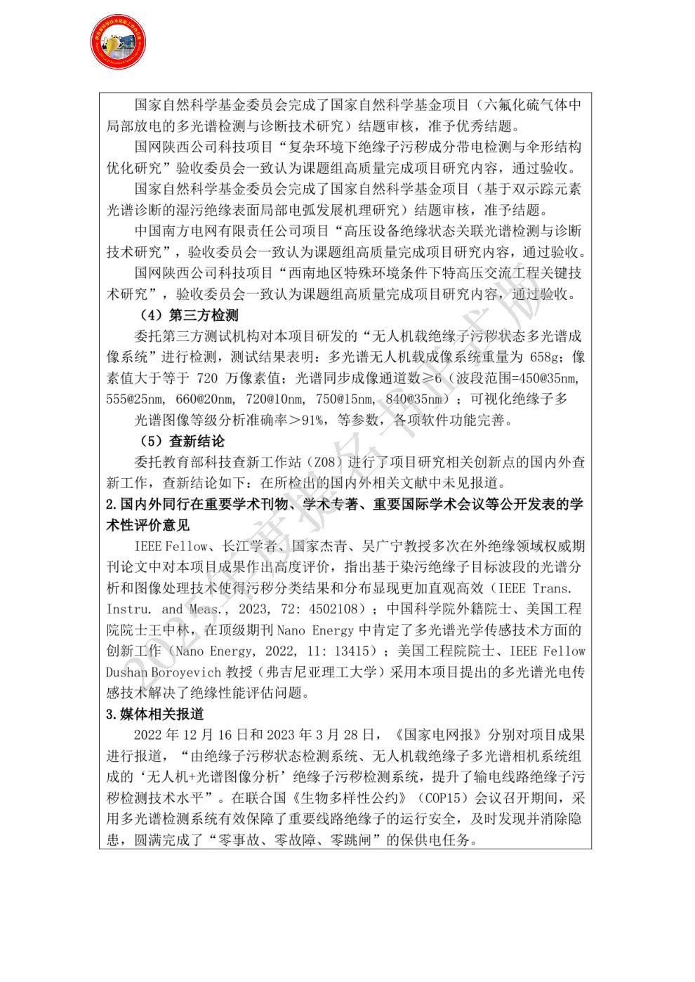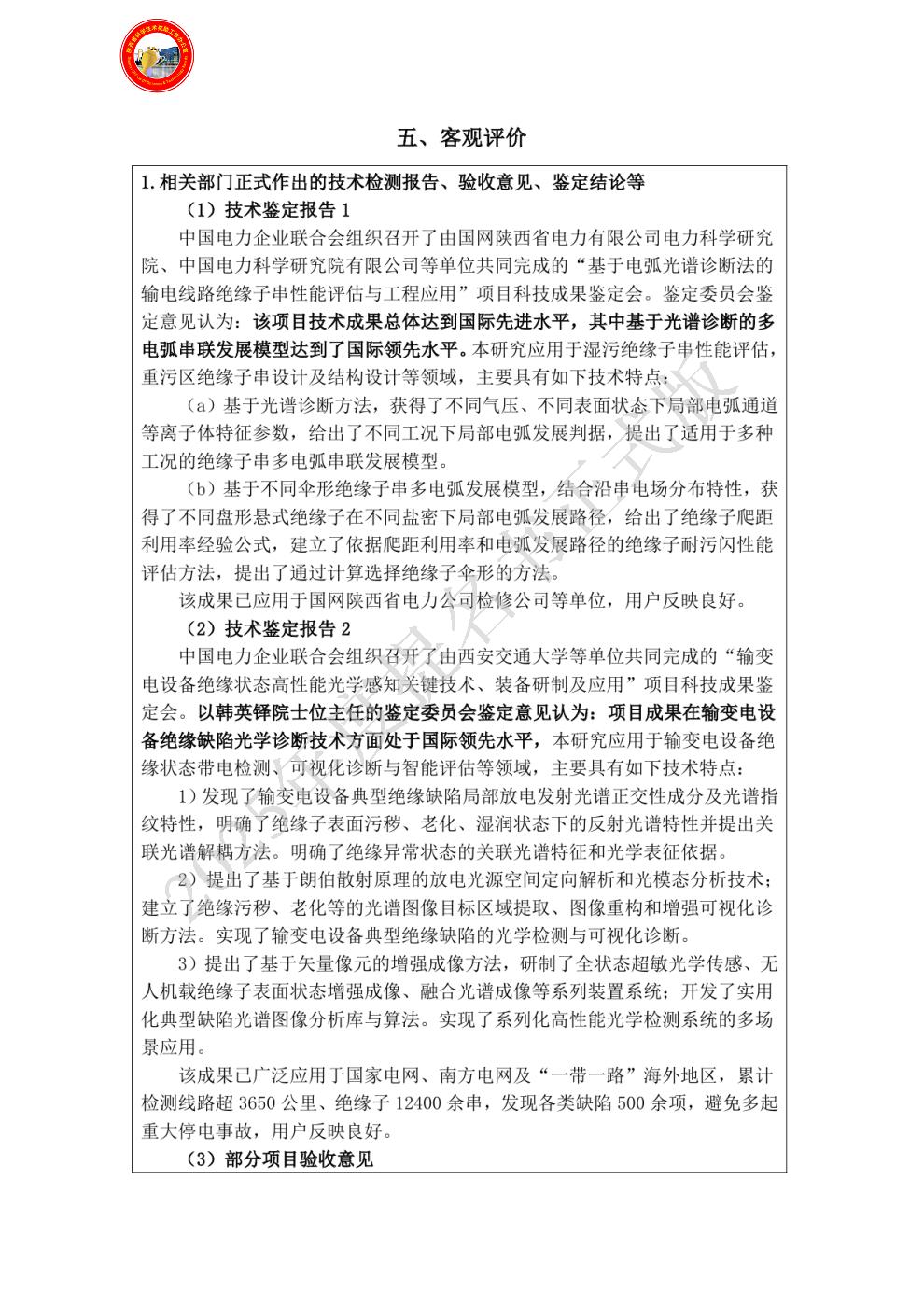 排名:3 行政职务:无 技术职称:高级工程师 工作单位:国网陕西省电力有限公司电力科学研究院 对本项目技术创造性贡献:项目技术攻关人员,进行了结构优化后的绝缘子线路应用,建立了陕西地区绝缘子表面污秽成分高光谱数据库。对创新点1、3项均做出了重要贡献。[旁证材料:鉴定证书F6-4,验收报告F6-5,查新报告F6-6等]。