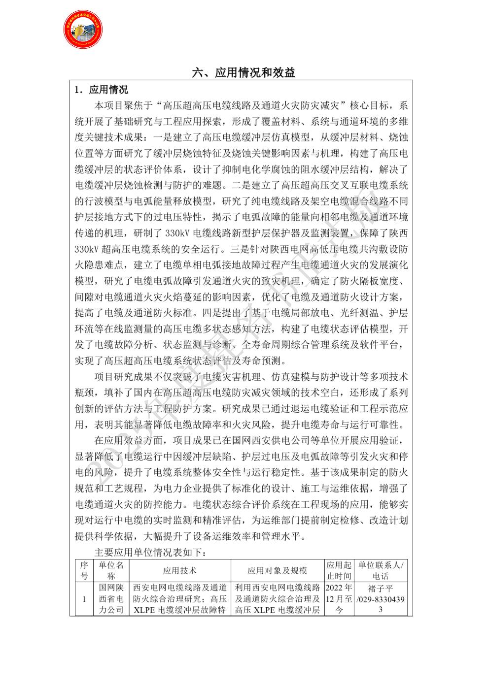 项目成果不仅在陕西地区西安供电公司、宝鸡供电公司、渭南供电公司得到了广泛应用,还在上海电缆分公司等得到了推广应用。项目成果社会、经济效益显著,填补了高压超高压电缆线路及通道防灾减灾技术的空白,在相关领域起到了引领作用。