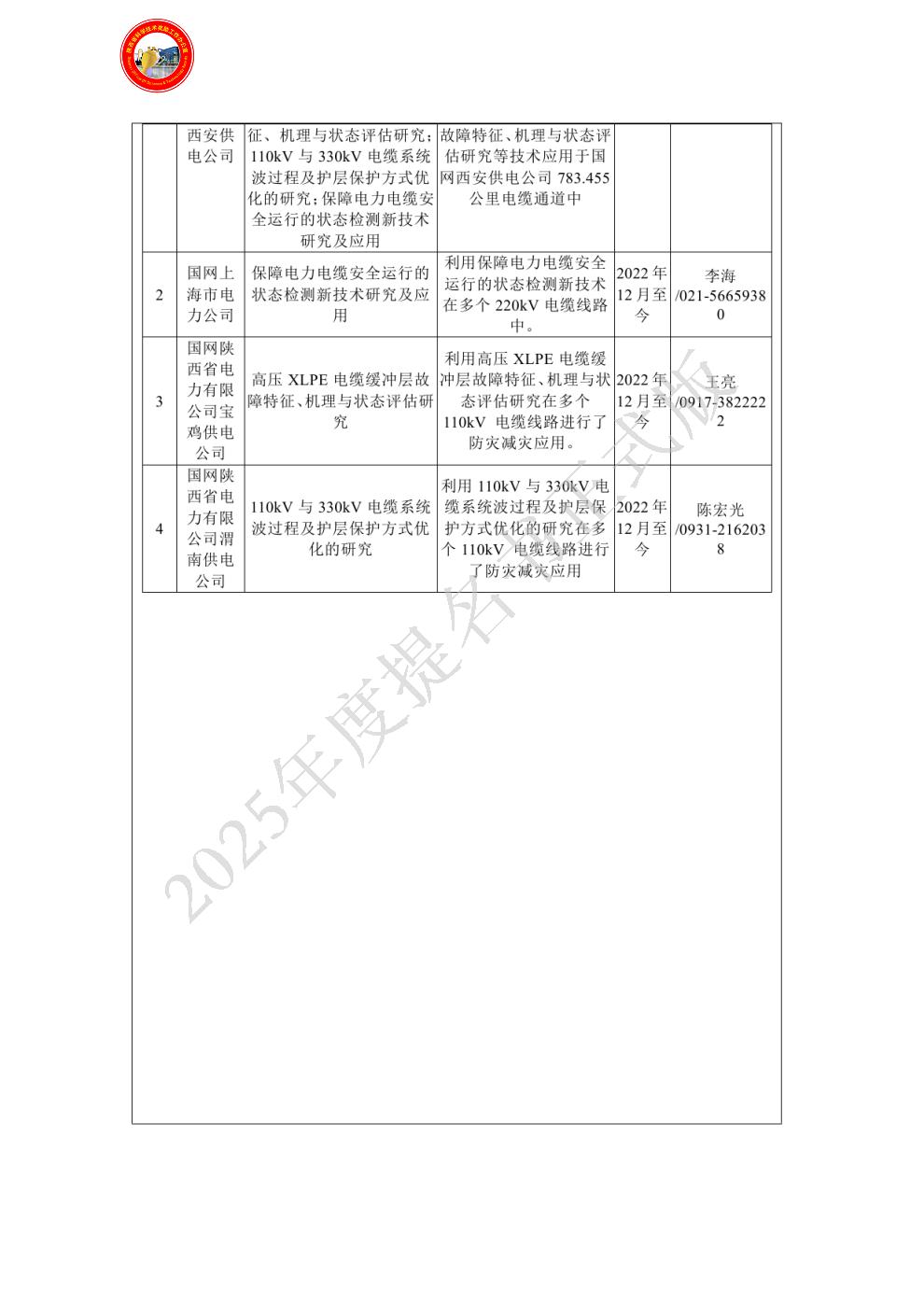 排名:7 行政职务:副班长 技术职称:工程师 工作单位:国网陕西省电力有限公司西安供电公司 对本项目技术创造性贡献:参与陕西西安地区电缆线路运行现状、故障类型的调研和分析,收集陕西西安地区电缆的基本参数信息;组织、安排和参与电缆故障的现场测试实验,推动项目的研究进展 曾获国家科技奖励情况:无