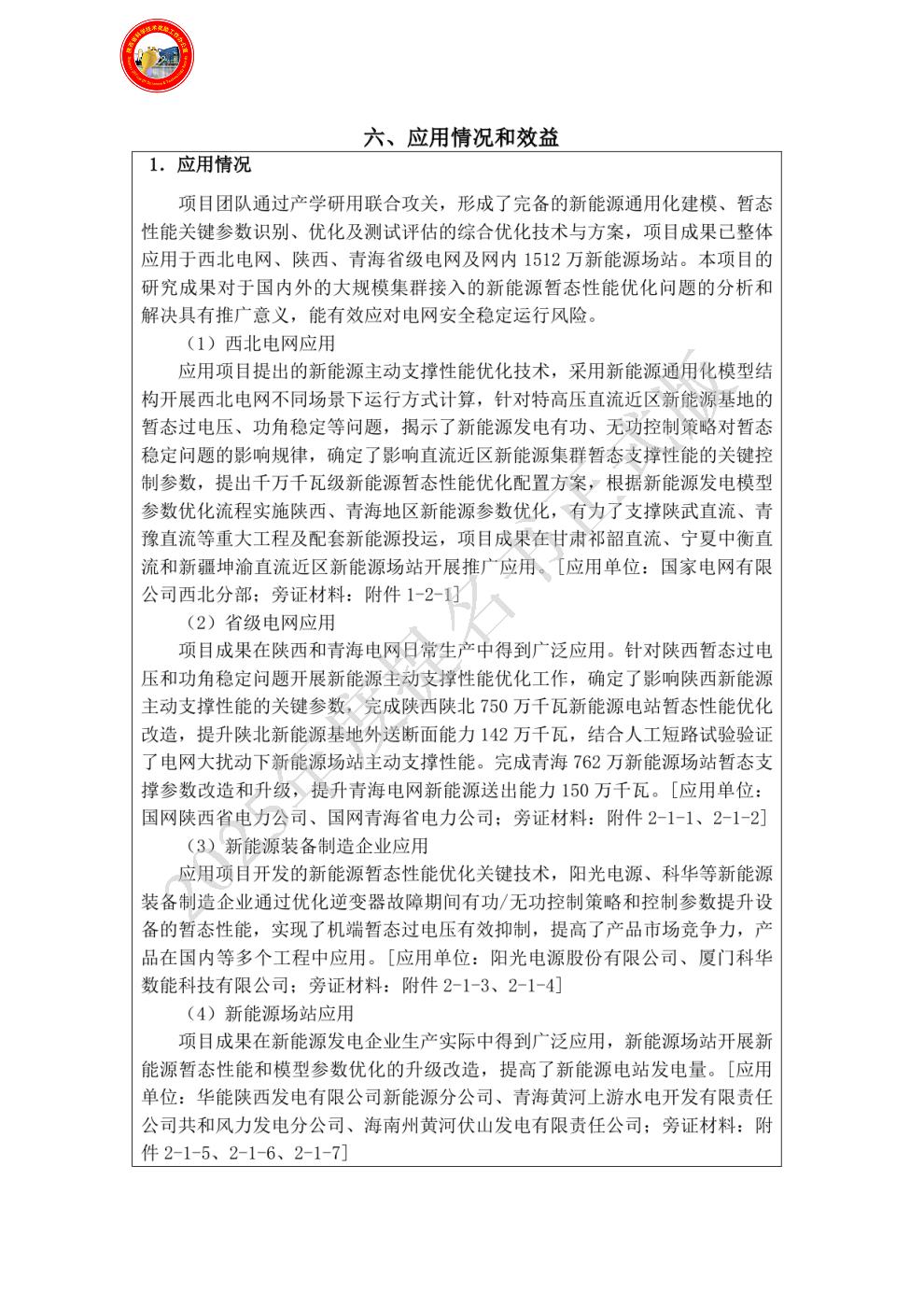 项目成果符合新能源发展及并网技术性能升级的需求,市场应用前景十分广阔。项目成果已在电网中完成应用,有力支撑了陕武直流、青豫直流等重大工程及配套新能源投运,有力促进了新能源消纳,提升陕西、青海电网新能源外送断面292万千瓦。项目团队还与阳光电源、科华等设备企业合作,提升设备电网适应性,促进行业技术升级。上述成果应用后,取得了显著的社会经济效益。