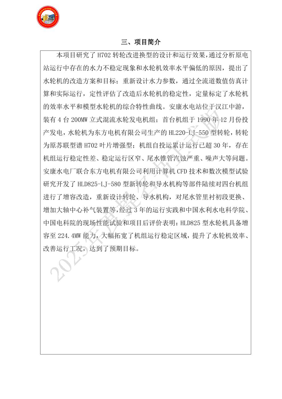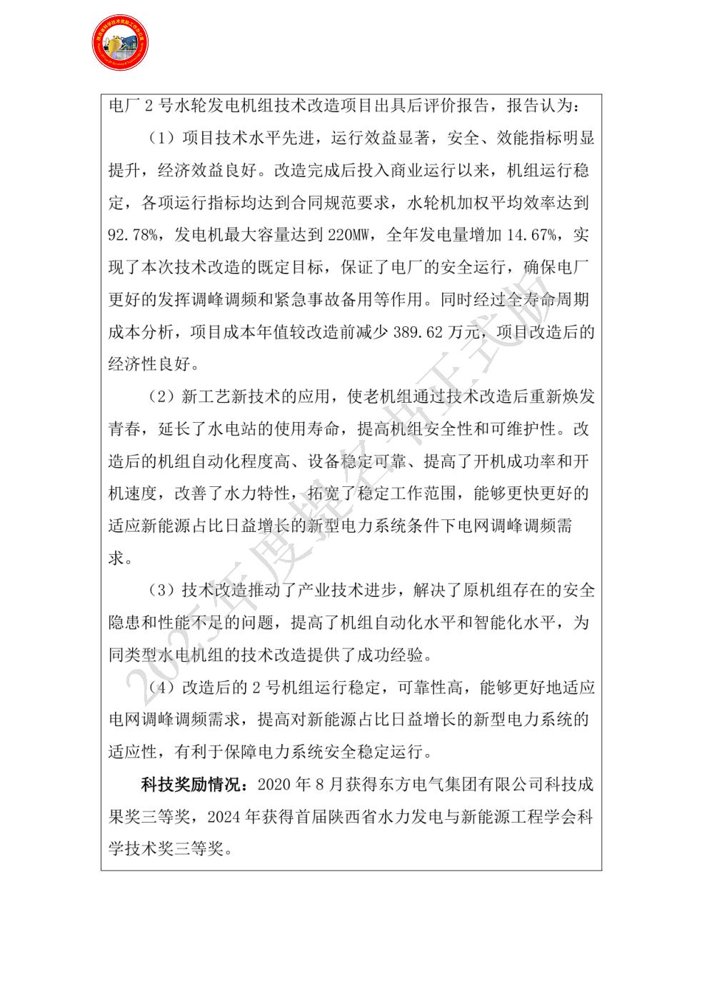 单位贡献:1.水轮机改造项目的前期可行性研究、立项,项目申报及招投标管理。