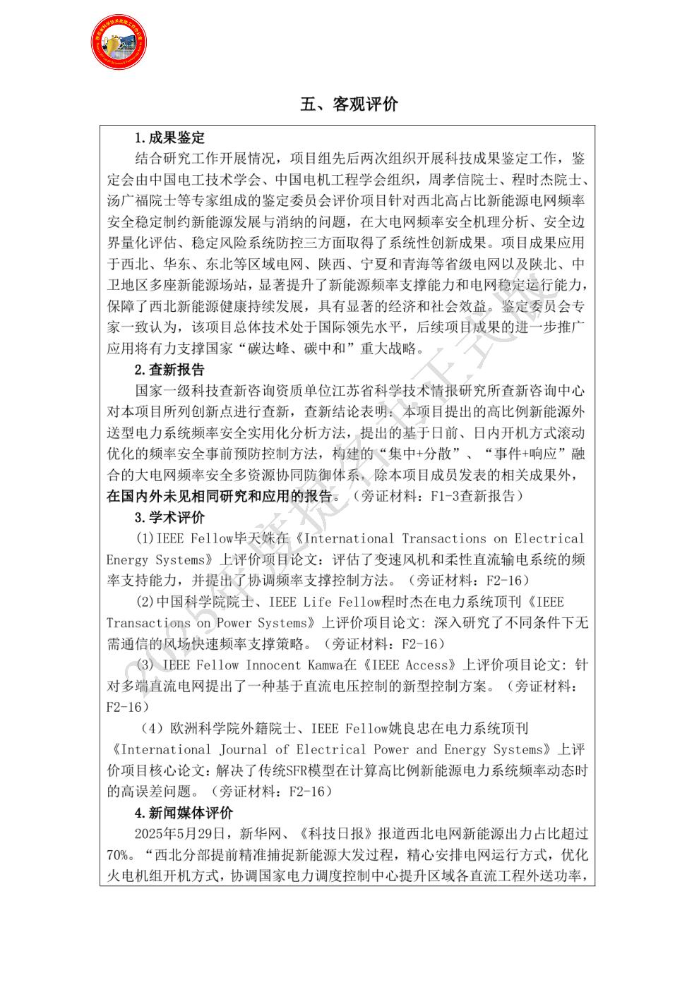 | 提名单位意见: | 该项目以高比例新能源外送型电力系统频率安全这一问题为主线,深入开展大电网频率安全解析分析和量化评估、新能源快速频率响应和协同控制、大电网频率安全动态防控等方面取得系列科技创新成果。项目成果已应用于西北电网、陕西和青海等省级电网以及新能源场站,显著提升了新能源频率支撑能力和电网稳定运行能力,保障了西北新能源健康持续发展,具有显著的经济和社会效益,进一步推广应用将有力支撑国家“碳达峰、碳中和”重大战略。