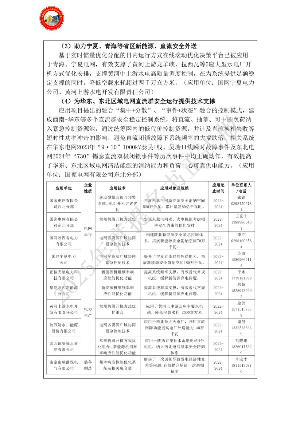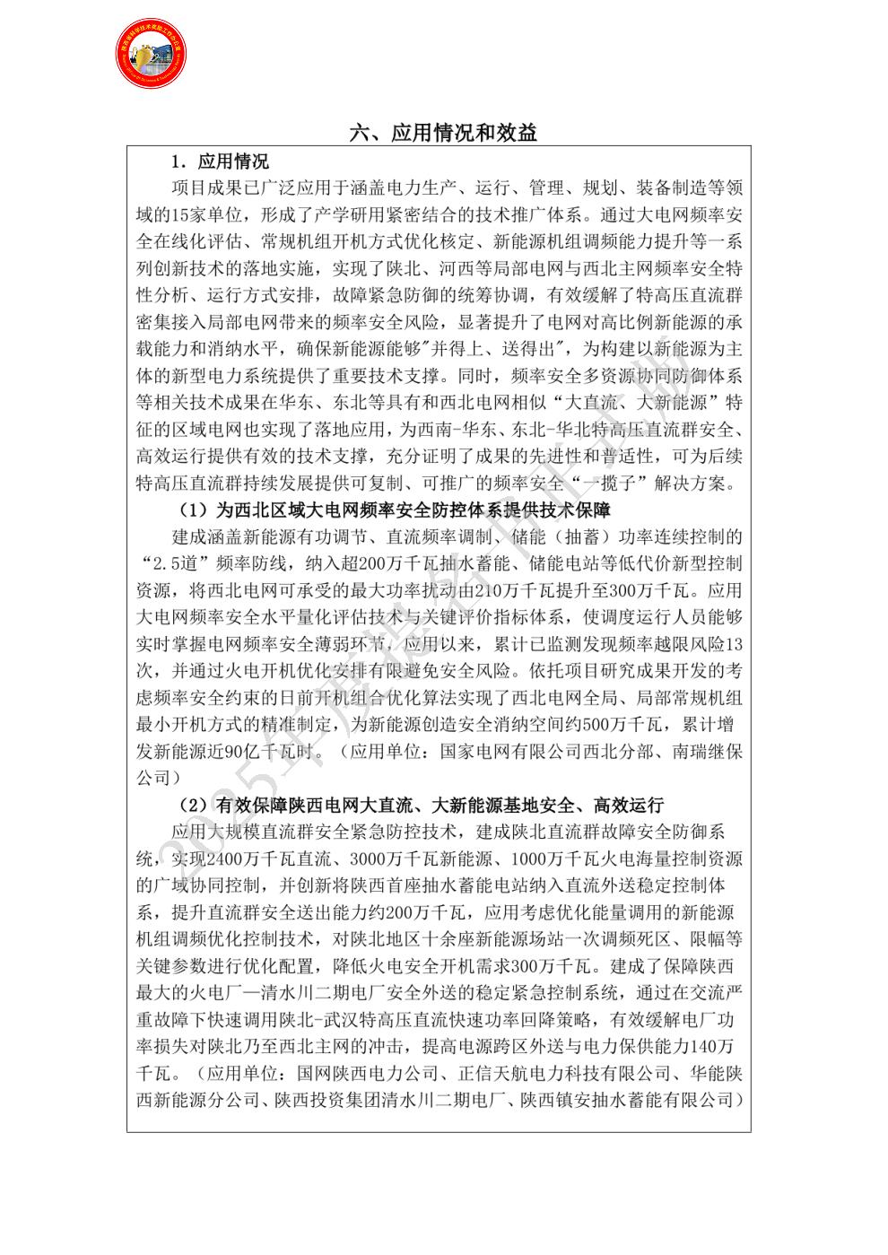 单位贡献:作为第六完成单位,应用项目研究提出的大规模直流群频率安全稳定紧急防御技术,建成了保障陕西清水川能源股份有限公司二期项目安全外送的安全稳定紧急控制系统,通过制定故障后的陕武直流回降策略,有力缓解了电厂功率损失对陕北乃至西北主网的冲击,并提高了清水川电厂的出力。上述措施应用以来,将清水川二期电厂4台百万机组安全外送能力由230万千瓦提升至370万千瓦,年均增发电量达到2.736亿千瓦时,有力支撑陕西电网负荷保供及电力高效外送目标。对创新点3做出贡献。
