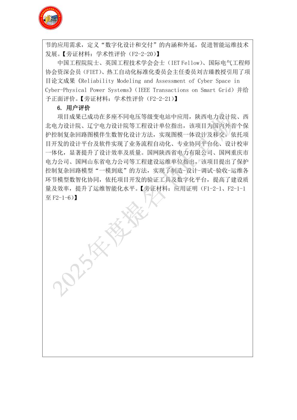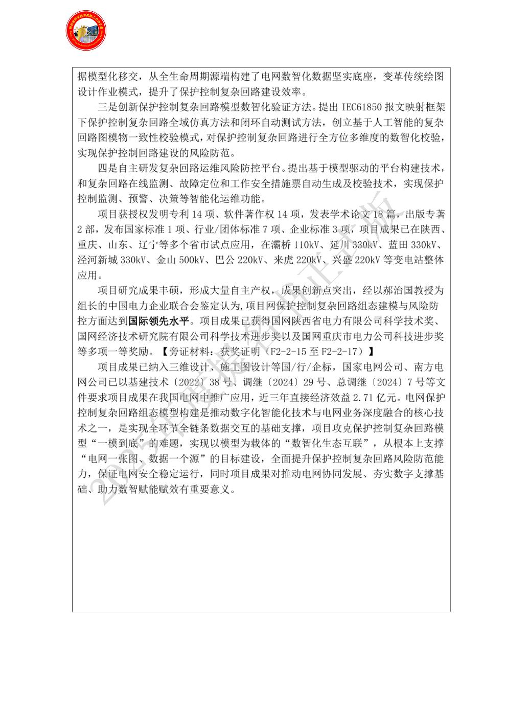 创造性贡献:对创新点3、4有突出贡献。创新点3中,参与完成了保护控制系统图模物一致性校验技术; 创新点4中,完成了保护控制复杂回路在线监测方法及故障定位技术,参与完成了二次安全措施票自动生成及校核技术。[旁证材料:软著F2-2-7] 曾获国家科技奖励情况:无