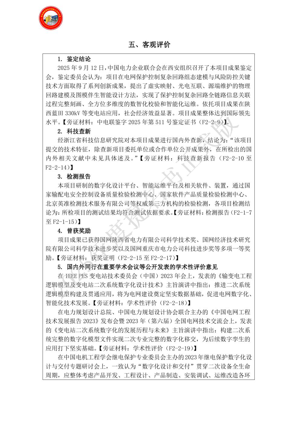 单位贡献:南京五采智电电力科技有限公司作为项目的主要完成单位之一,在创新点3、4中做出重要贡献。参与完成了保护控制系统图模物一致性校验技术;实现了保护控制复杂回路在线监测方法及故障定位技术,参与完成了二次安全措施票自动生成及校核技术。