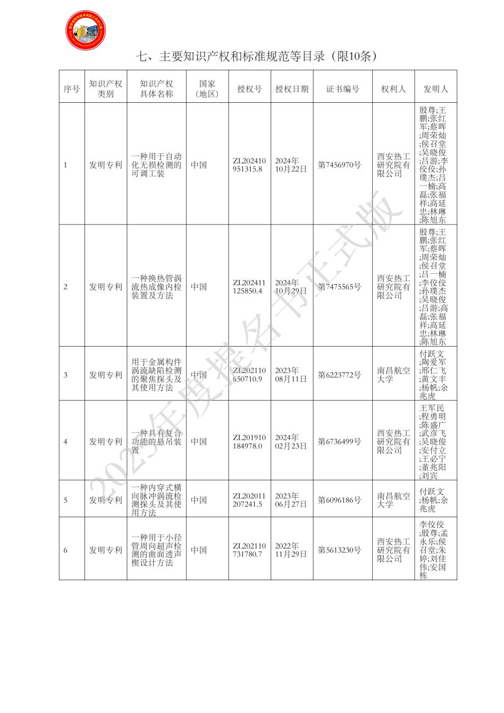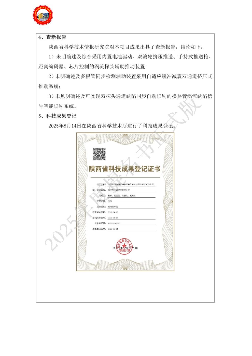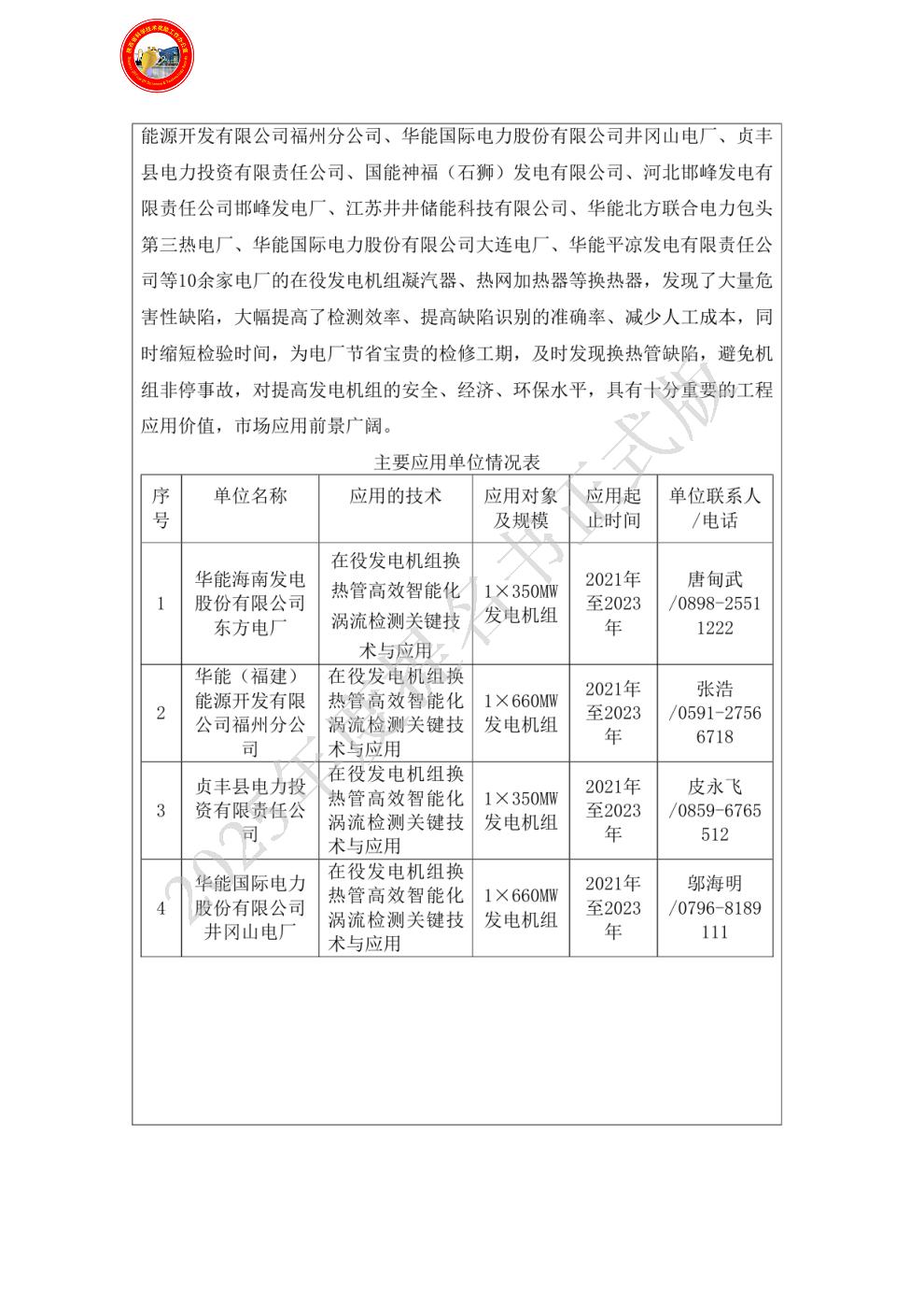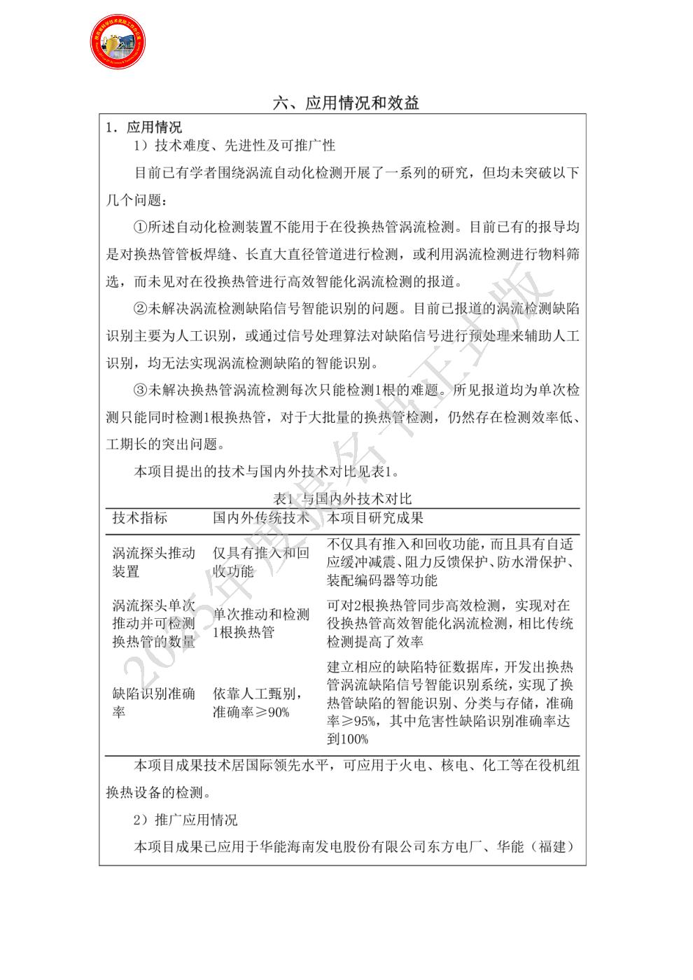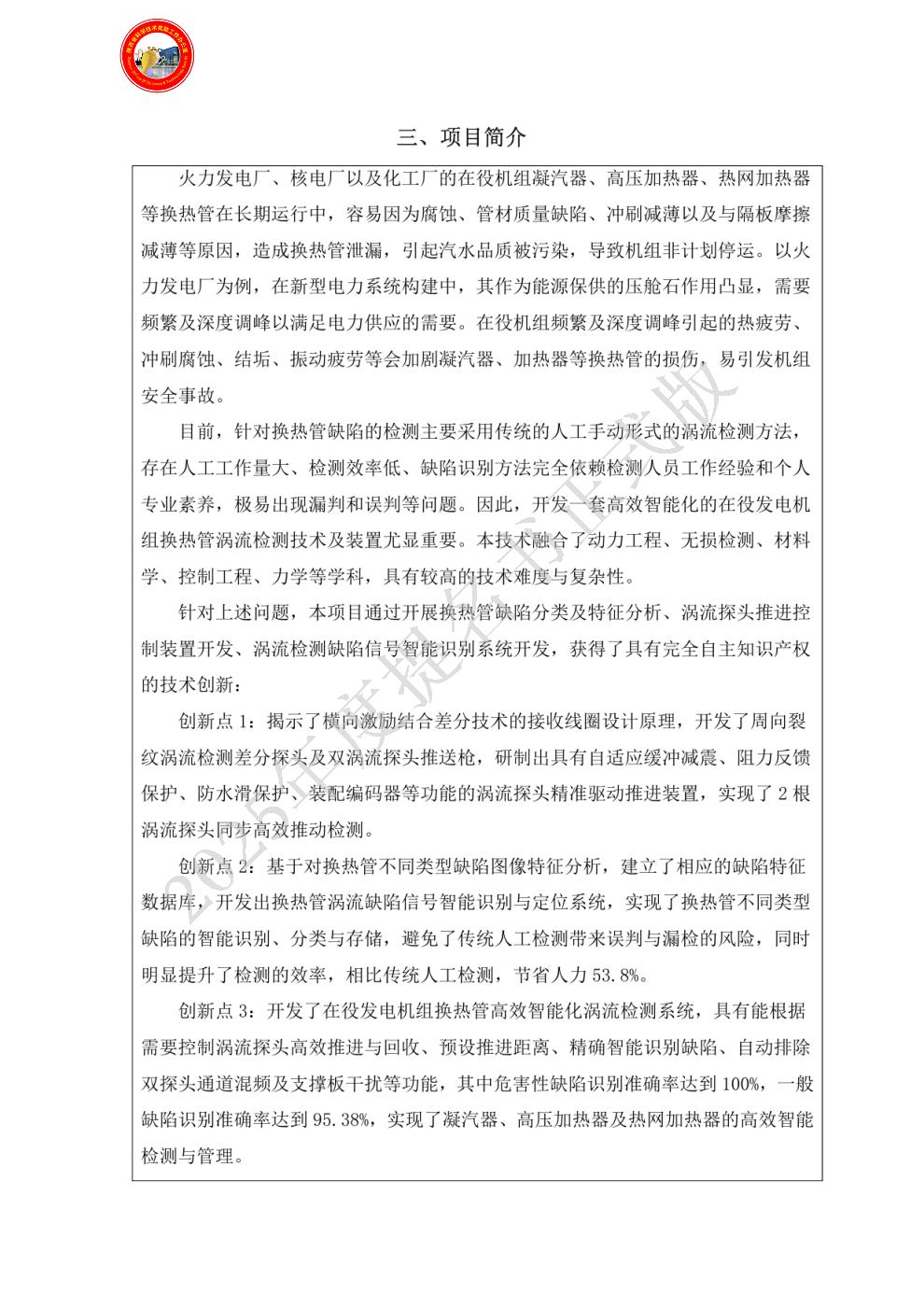 单位贡献:西安热工研究院有限公司作为该项目主要研发单位,全面负责项目整体技术路线规划、方案设计、项目执行推进等。提出了主要技术发明创新点,设计了横向激励结合差分设计的接收线圈,开发了双枪头涡流探头推送枪,研制出涡流探头精准驱动推进装置,实现了2根涡流探头同步高效推动检测;基于对换热管不同类型缺陷图像特征分析,建立了相应的缺陷特征数据库,开发出换热管涡流缺陷信号智能识别系统,实现了换热管缺陷的智能识别、分类与存储;开发了在役发电机组换热管高效智能化涡流检测关键技术,并负责本项目研究成果的推广应用。