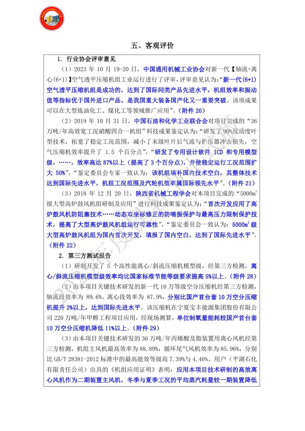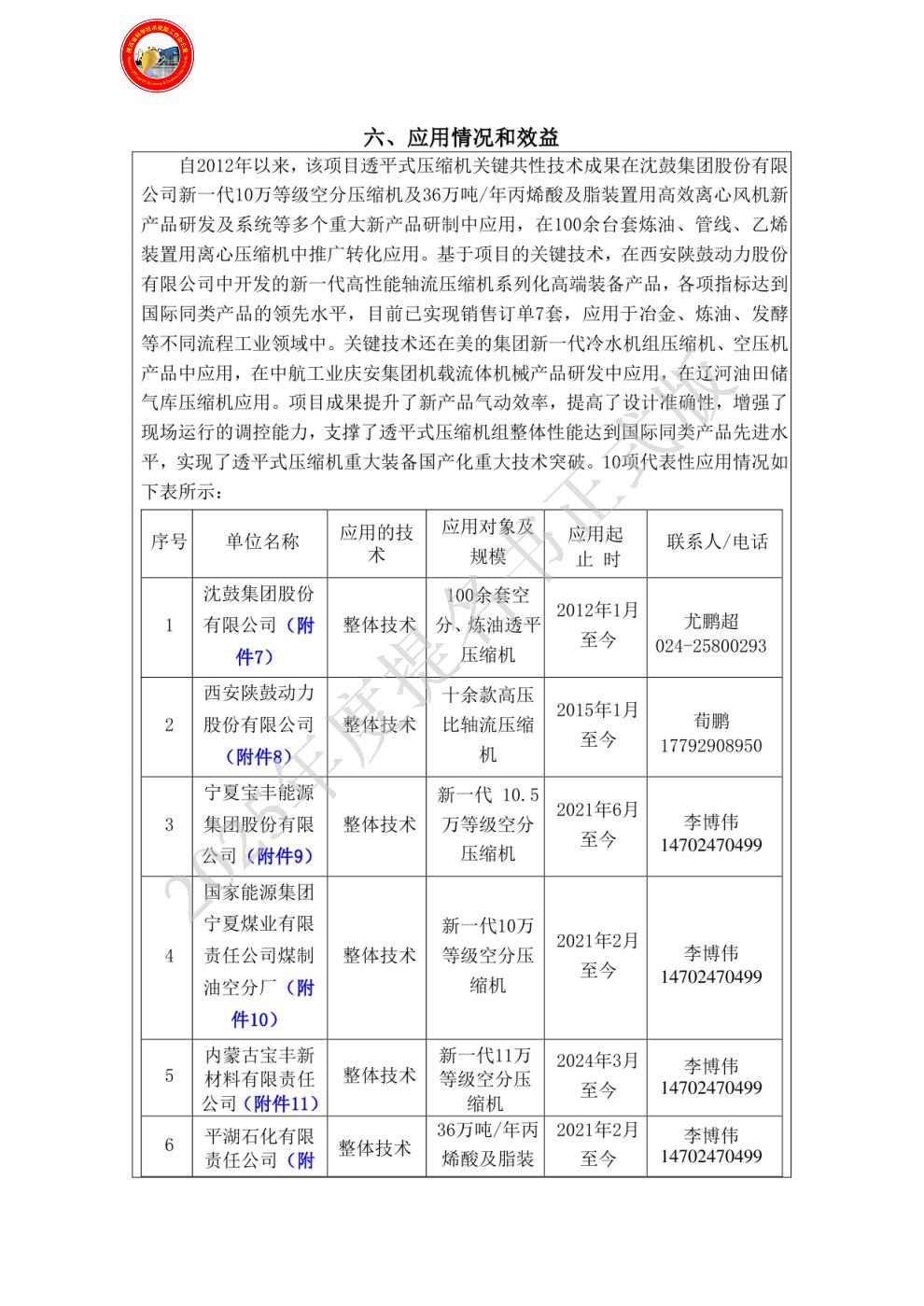 单位贡献:沈鼓集团股份有限公司是本项目创新点2、3、4的合作完成单位,是本项目整体技术的工业化应用单位之一。在离心压缩机高端装备的设计、制造研究中,沈阳鼓风机集团股份有限公司与西安交通大学保持长期、紧密的合作关系,具有良好的合作基础。在本项目中,针对透平式压缩机宽工况高效设计、重要透平压缩机装备研发和透平压缩机运行调控等行业共性问题,沈阳鼓风机集团股份有限公司与西安交通大学离心压缩机研发团队合作,开发了离心压缩机高维全工况设计系统,完成了大流量系数压缩机模型级的实验验证工作,完成了新一代10万等级空分压缩机新产品研发及系统节能示范、36万吨/年丙烯酸及酯装置用高效离心风机新产品研发及系统节能示范。将本项目的关键技术成果应用于沈阳鼓风机集团股份有限公司,并完成了多台国内首台套新产品的研制,并转化应用于100余台套空分、炼油装置用透平压缩机中,打破了国外技术垄断和市场封锁。