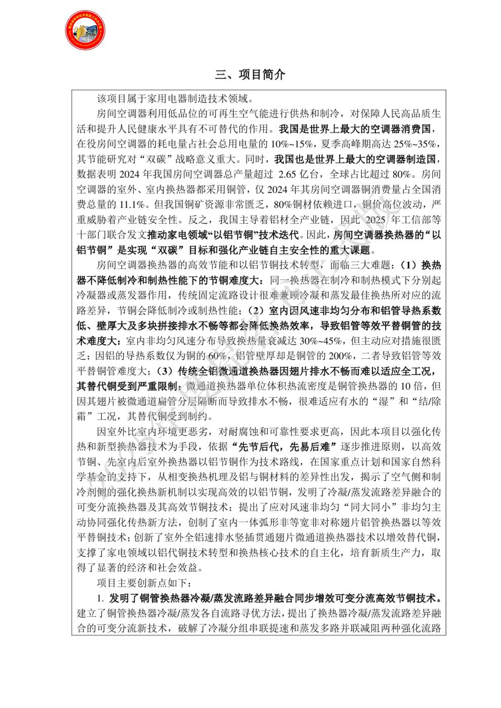 单位贡献:项目的第一完成单位,主要创新点1~3提出者,负责整个项目的研究方案、技术路线和相关系列技术推广。在国家重点研发课题、国家自然科学基金等项目的支持下,在房间空调器换热器高效节铜和替代铜关键技术及产业化领域开展研究,将基础研究、技术研发和工程应用相结合,主要贡献如下:1)发明了铜管换热器冷凝/蒸发流路差异融合同步增效的可变分流高效节铜技术,实现相同制冷和制热能力下铜材使用大幅减小;2)发明了室内一体弧形非等宽不对称翅片小管径铝管换热器等效平替代铜技术,翅片铝管换热器在同等耗材下换热量较铜管换热器提升;3)发明了室外速排水全工况竖插贯通翅片全铝微通道换热器增效替代铜及耐腐蚀技术,破解了微通道换热器难以适应“干-湿-结霜-除霜”热泵全工况的难题,并实现单排微通道换热器可替代3~5排铜管换热器的目标。