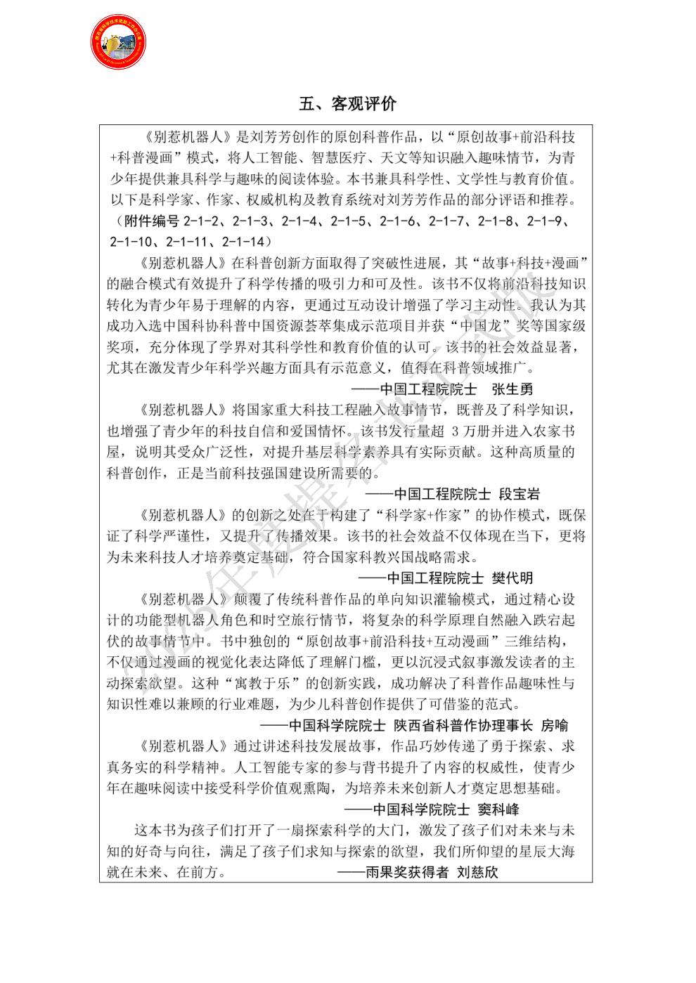排名:1 行政职务:无 技术职称:编辑 工作单位:西安电子科技大学 对本项目技术创造性贡献:《别惹机器人》为刘芳芳独立原著作品(附件编号1-1) 曾获国家科技奖励情况:2024年,个人被科技部、中央宣传部、中国科协评为“全国科普工作先进工作者”;《了不起的中国制造》系列、《麦芽儿成长记》心理科普文学系列入选中国科协科普中国资源荟萃集成示范项目。2025年,《了不起的中国制造》系列获第五届“童阅中国”年度原创好童书奖,获陕西省优秀科普图书一等奖。