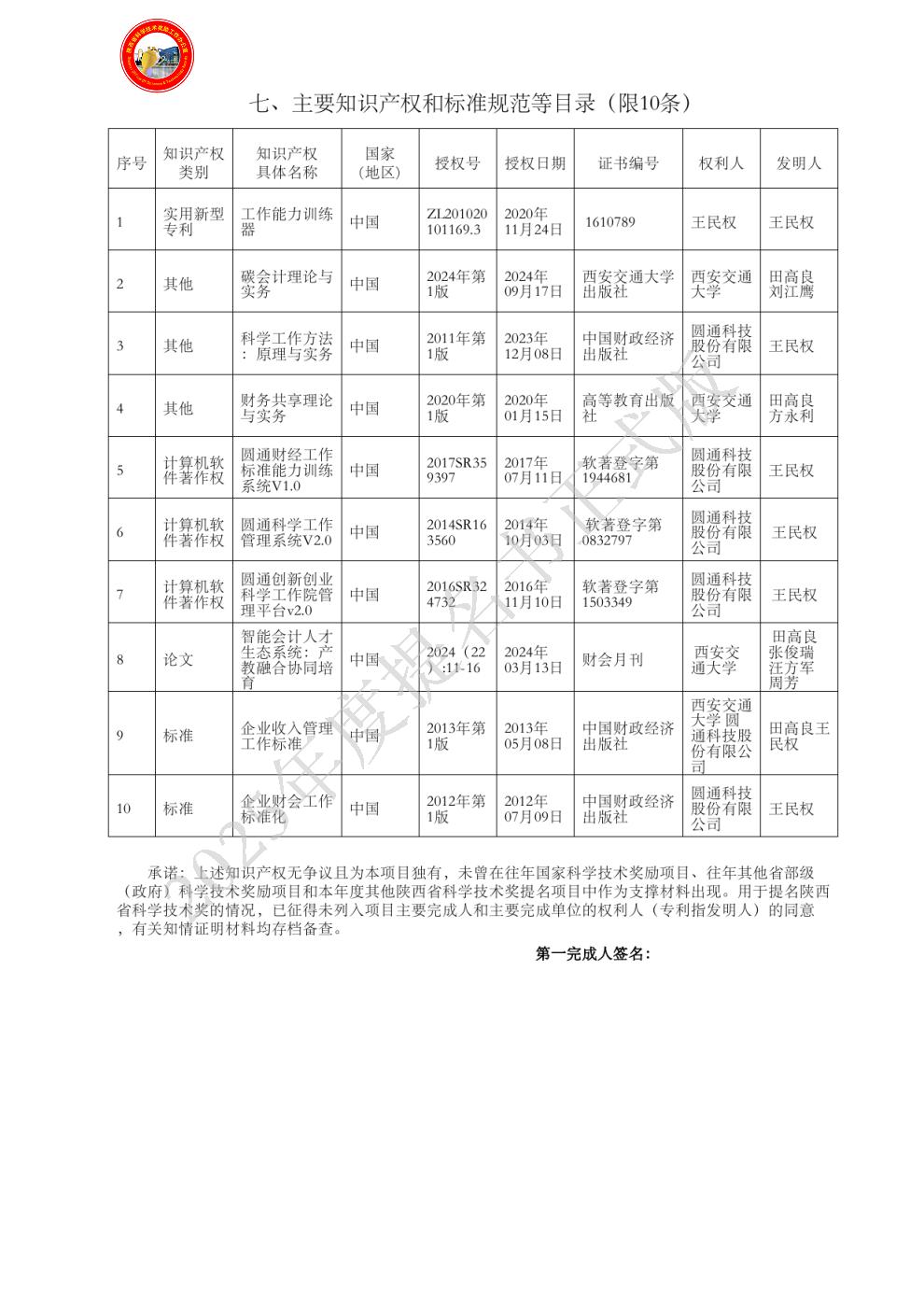 排名:7 行政职务:无 技术职称:高级会计师 工作单位:西安交通大学 对本项目技术创造性贡献:对创新点2、4作出重要贡献。1.项目第七主要完成人,从 2013 年起参与圆通制科学工作标准研究工作;2.带队赴企事业单位调研会计岗位工作现状,组织问题的讨论与资料的分析,指导调研报告的撰写;3.参与讨论并推进西安交通大学管理学院《圆通制会计工作能力训练中心》建设工作;4.为西安交通大 学管理学院会计学专业本科生圆通制会计工作标准训练工作提供实践经验指导;5.参与组织、协调信永中 和等单位《会计工作科学理论与实践》培训;6.佐证材料:参与部分成果研究、获奖等3件(见附件9、17、26)。
