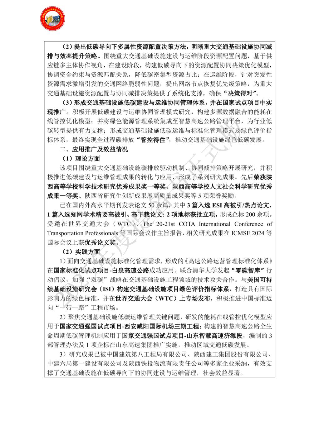 排名:1 行政职务:副校长 技术职称:教授 工作单位:长安大学 对本项目技术创造性贡献:作为本项目第一主要完成人,主持项目的申报、实施与总结,形成了相关论文、标准等多项成果。制定重大交通基础设施低碳建设与运维协同管理理论与实践研究主要内容与框架,构建数据驱动的低碳运维管理模式及实现推广应用等工作,形成完备的低碳管理标准,对主要科技创新1、2、3均做出重要贡献。(支撑材料见附件1.1、1.3、2.1.7~2.1.12、2.2.1~2.2.5、2.2.7) 曾获国家科技奖励情况:(1)2023,陕西高等学校科学技术研究优秀成果一等奖,市厅级,陕西省教育厅,排名2;(2)2025,陕西高等学校人文社会科学研究优秀成果一等奖,市厅级,陕西省教育厅,排名1;(3)2019,陕西省优秀青年科技新星,省部级,陕西省科学技术厅;(4)2020,陕西青年科技奖,中共陕西省委组织部;(5)2013,陕西省青年科技新星,省部级,陕西省科学技术厅,排名1 - 姓名:白礼彪