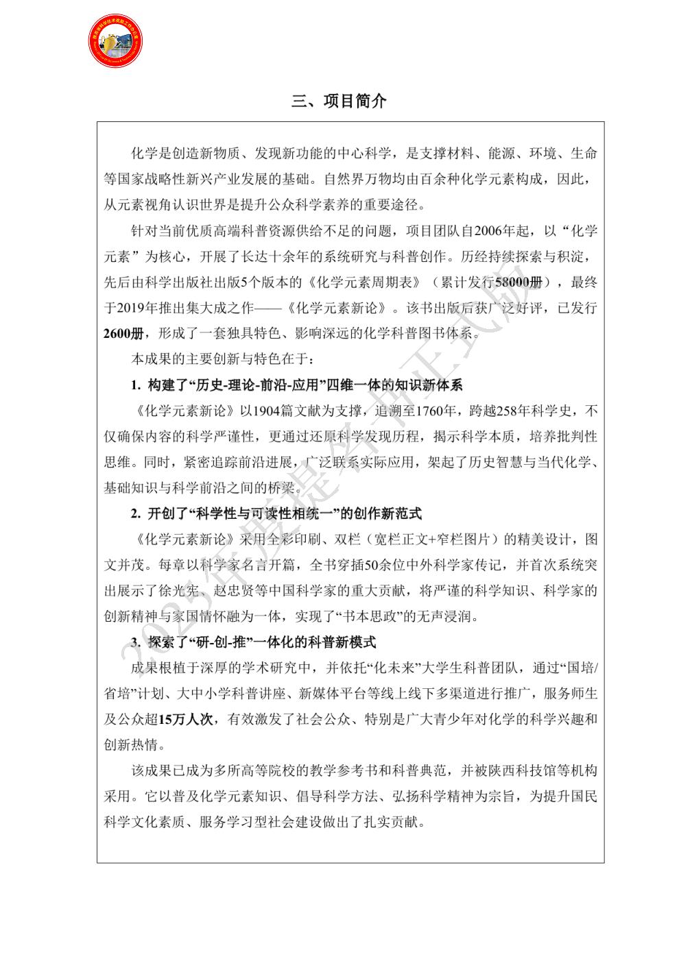 | 提名单位意见: | 化学是认识与改造客观世界的关键学科,提升全民化学素养对于实施科教兴国战略、建设学习型社会意义重大。成果完成人团队历时十余年,潜心钻研,成功构建了以《化学元素新论》为核心的化学科普体系,取得了显著社会效益。