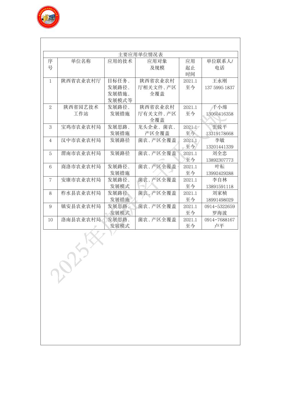 | 提名单位意见: | 该成果通过深入研究提出了5年将陕西食用菌产业发展为千亿级大产业的目标定位科学,发展路径创新性强,技术路线可行,布局起点高,前瞻性强,管理理念先进,多数观点被采纳到具体政策文件中,对行业发展起到了积极推动作用,经过有关市县的应用推广后,产生了显著的经济效益和社会效益。