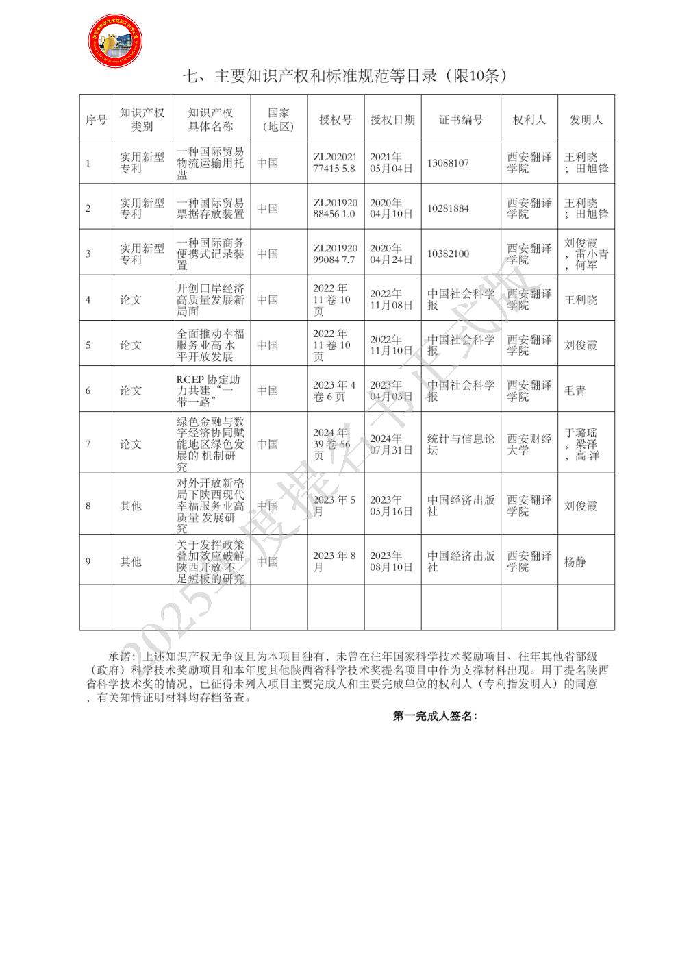 排名:2 行政职务:院长 技术职称:教授 工作单位:西安翻译学院 对本项目技术创造性贡献:围绕智慧口岸建设推动对外高水平开放展开深入研究,配合团队负责人协调项目的组织、调研和报告撰写。建设完成省创新青年团队项目完成《对外开放新格局下陕西现代幸福服务业高质量发展研究》专著 1 部,发表《全面推动幸福服务业高水平开放发展》《关中平原城市群发展内在机理与路径选择》论文,完成陕西省科技厅软科学项目和陕西省发改委委托项目等相关课题,成果被陕西省发改委、陕西省物流学会等政府和行业协会采纳。 曾获国家科技奖励情况:2025年陕西高等学校科学技术研究优秀成果二等奖,第二完成人 - 姓名:杨凌