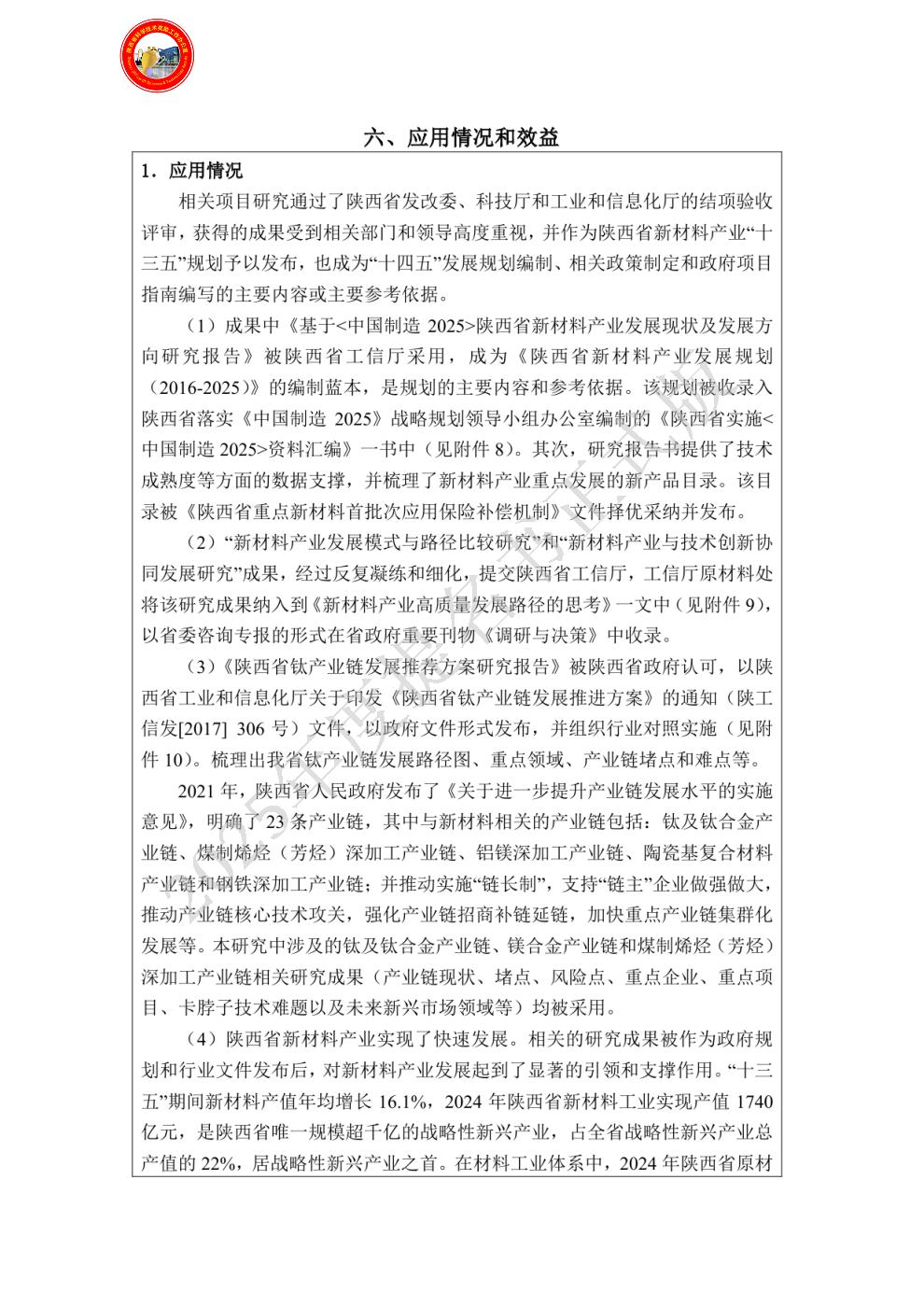| 提名单位意见: | 该项目面向国家新材料产业自主可控与高质量发展的重大战略需求,聚焦陕西省新材料领域“科技强、产业弱”的结构性矛盾,系统开展了覆盖全产业链、创新链与资本链的软科学-工程化联合研究。项目以“理论构建—实证分析—对策提出”为主线,首次在西部地区完成县市级园区“毛细血管”式高密度调研,填补了县域新材料产业数据空白;原创提出“新四化”发展路径与“三链协同”框架,被直接采纳并写入《陕西省新材料产业“十四五”发展规划》《钛及钛合金产业链提升方案》等省级政策文件,成为政府顶层设计的重要依据。成果构建了全省重点项目、重点产品目录的动态项目库,建立品牌价值链驱动的产业跃升模式,对全省新材料产业产值持续增长、打造千亿级化工材料、钛及钛合金等创新集群起到推动和支撑作用,经济社会效益显著。该项目构建的研究范式、政策工具箱及转化模板对破解西部科教资源“沉睡”难题、培育新质生产力具有重要示范价值,对国内其它省份也具有推广应用价值。