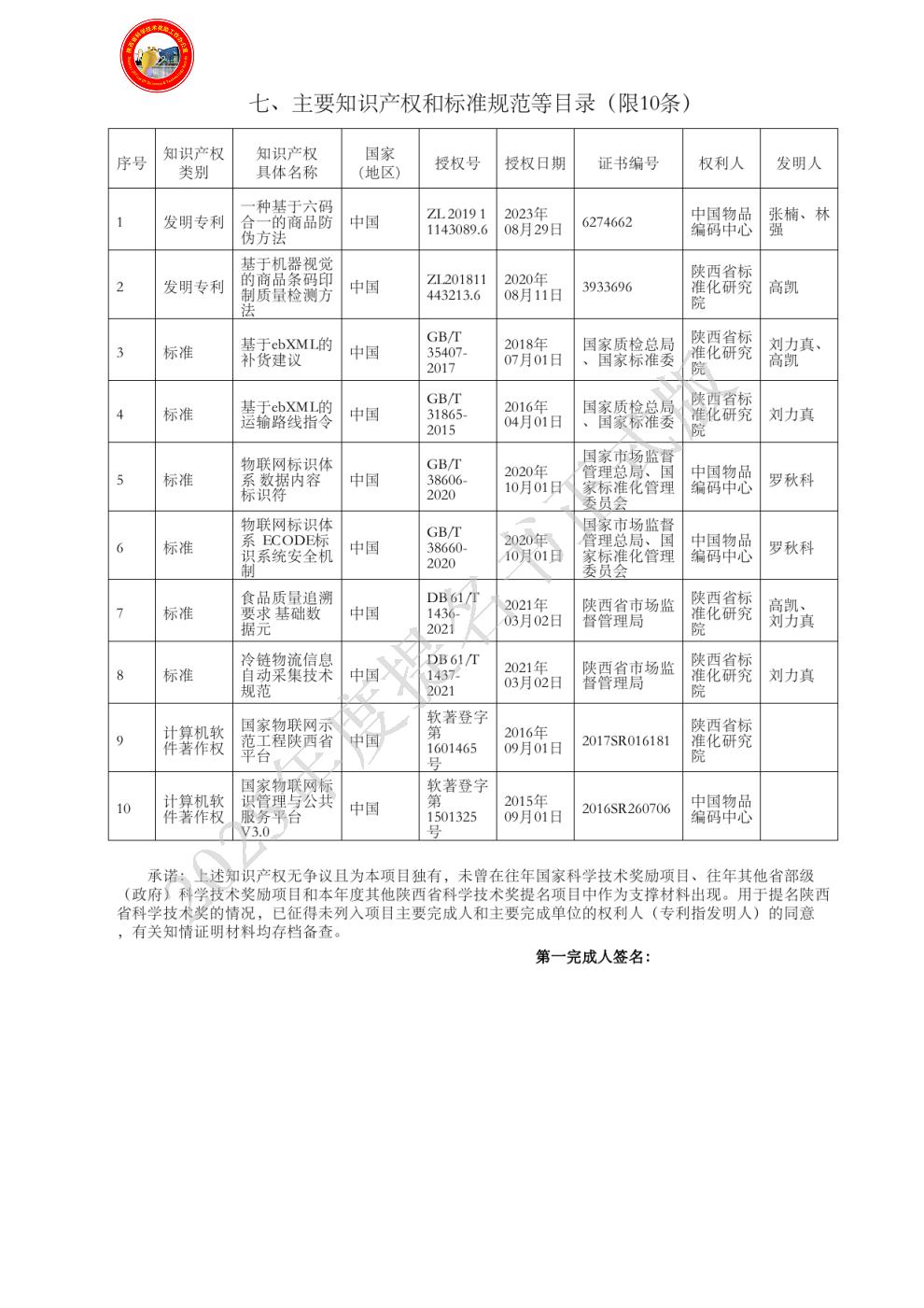 单位贡献: 陕西省标准化研究院作为项目的牵头承担单位,组织项目的各参与单位,确定项目整体研究方向,制定项目技术架构、方案,有效的推动了项目研究与实施。我院在项目中承担了平台建设、标准编制、数据汇聚以及追溯实施工作,开展了基于机器视觉技术的商品条码印刷质量检测装置研究,申请并获得了“一种商品条码图像采集装置”、“一种无线数据终端装置”等专利授权,制定发布了5项国家标准,7项地方标准发表论文5篇。一项发明专利荣获陕西省专利奖,完成创新点三、创新点四,参与完成创新点一和创新点二。