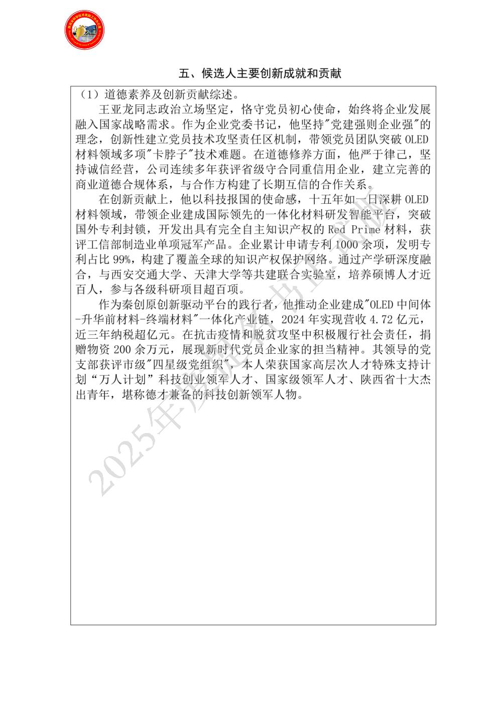 候选人主要创新成就和贡献: