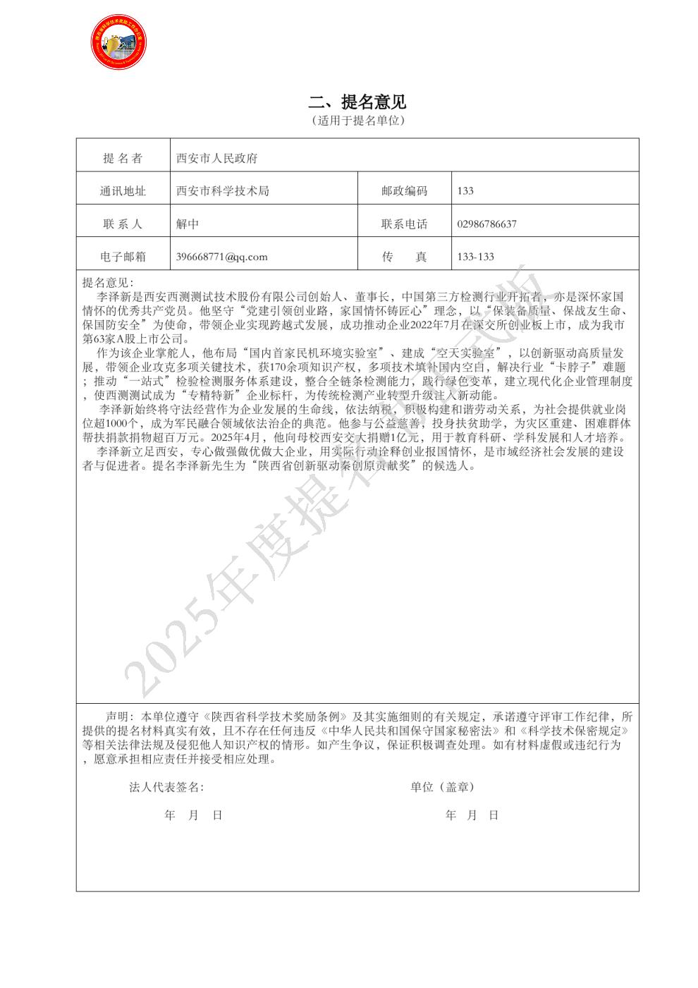 提名单位意见: