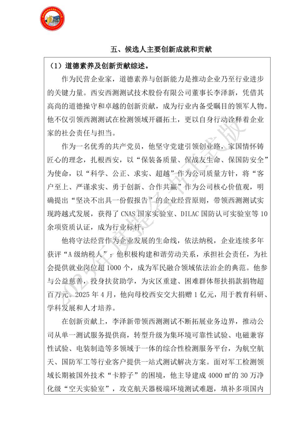 候选人主要创新成就和贡献: