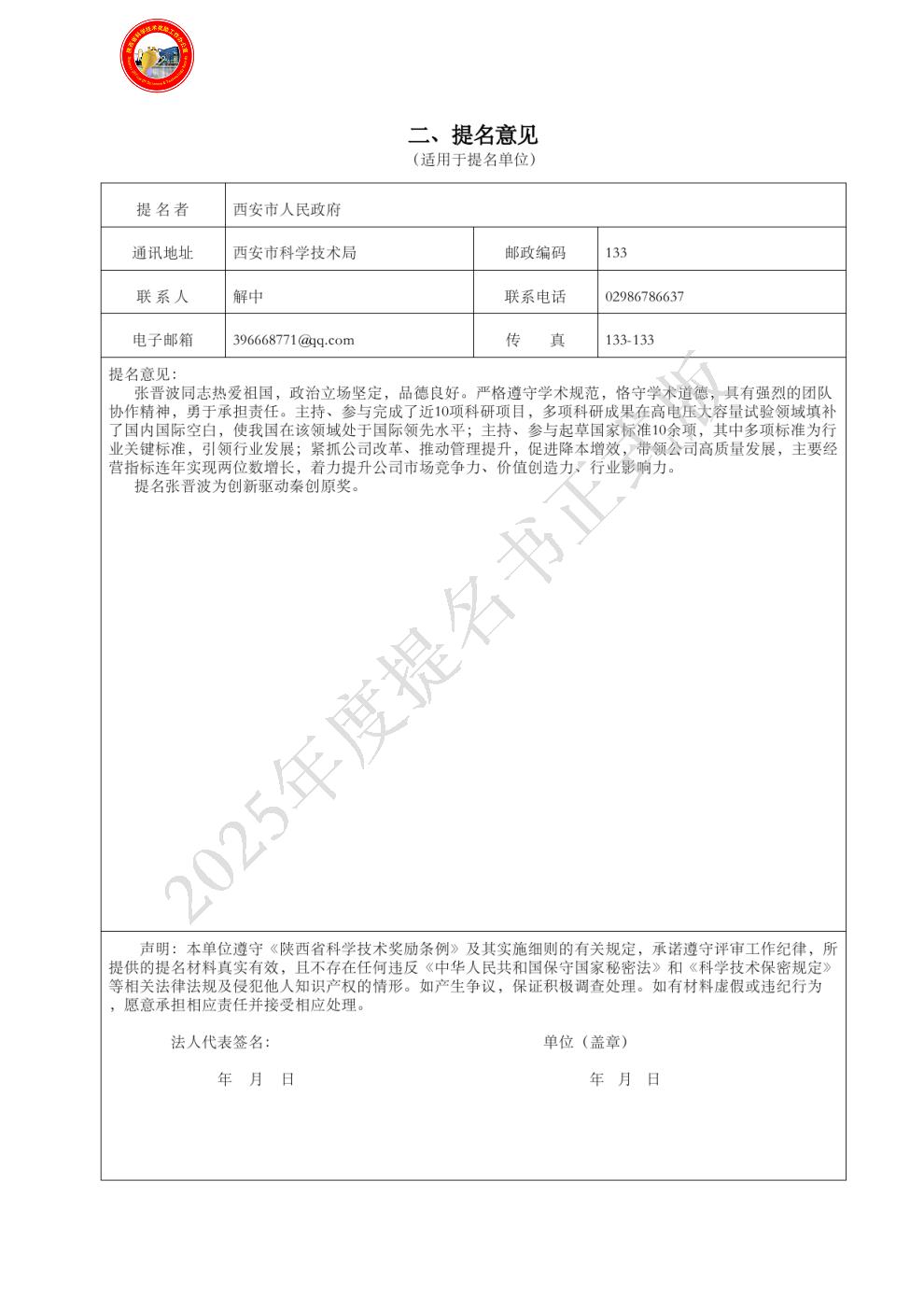 提名单位意见: