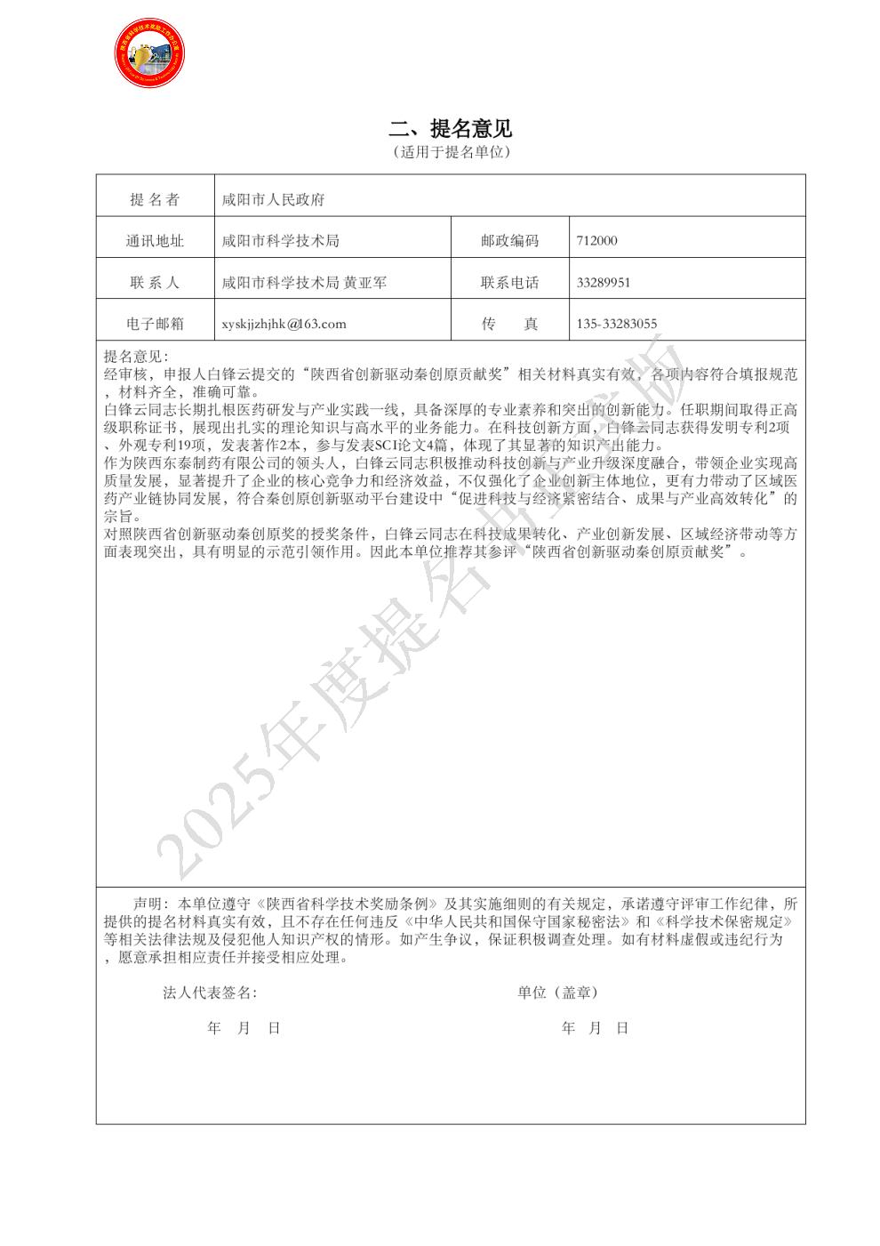 提名单位意见: