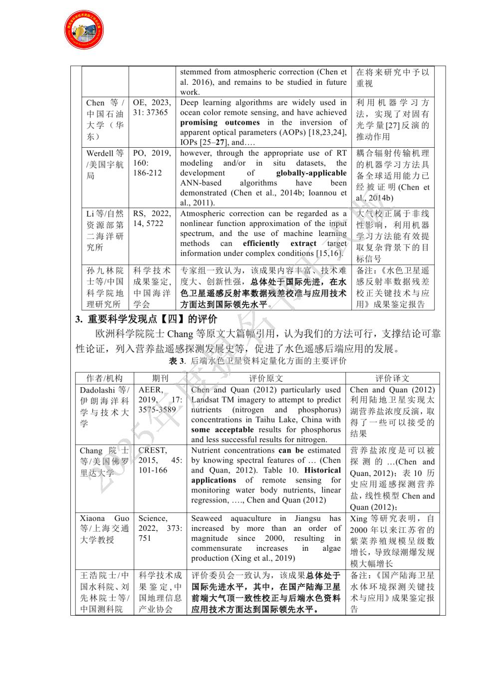 单位贡献:对《重要科学发现》中所列第(1)、(2)、(3)、(4)方面做出了创造性贡献,是所有5篇代表性论文的作者。具体表现在:提出了前端辐射质量评估与交叉定标协同校正方法;提出了浑浊水体近红外等效黑体假设大气校正方法;提出了中端遥感反射率数据残差逐像元精细校正方程;提出了后端耦合据残差波谱特征的水色产品反演方法。